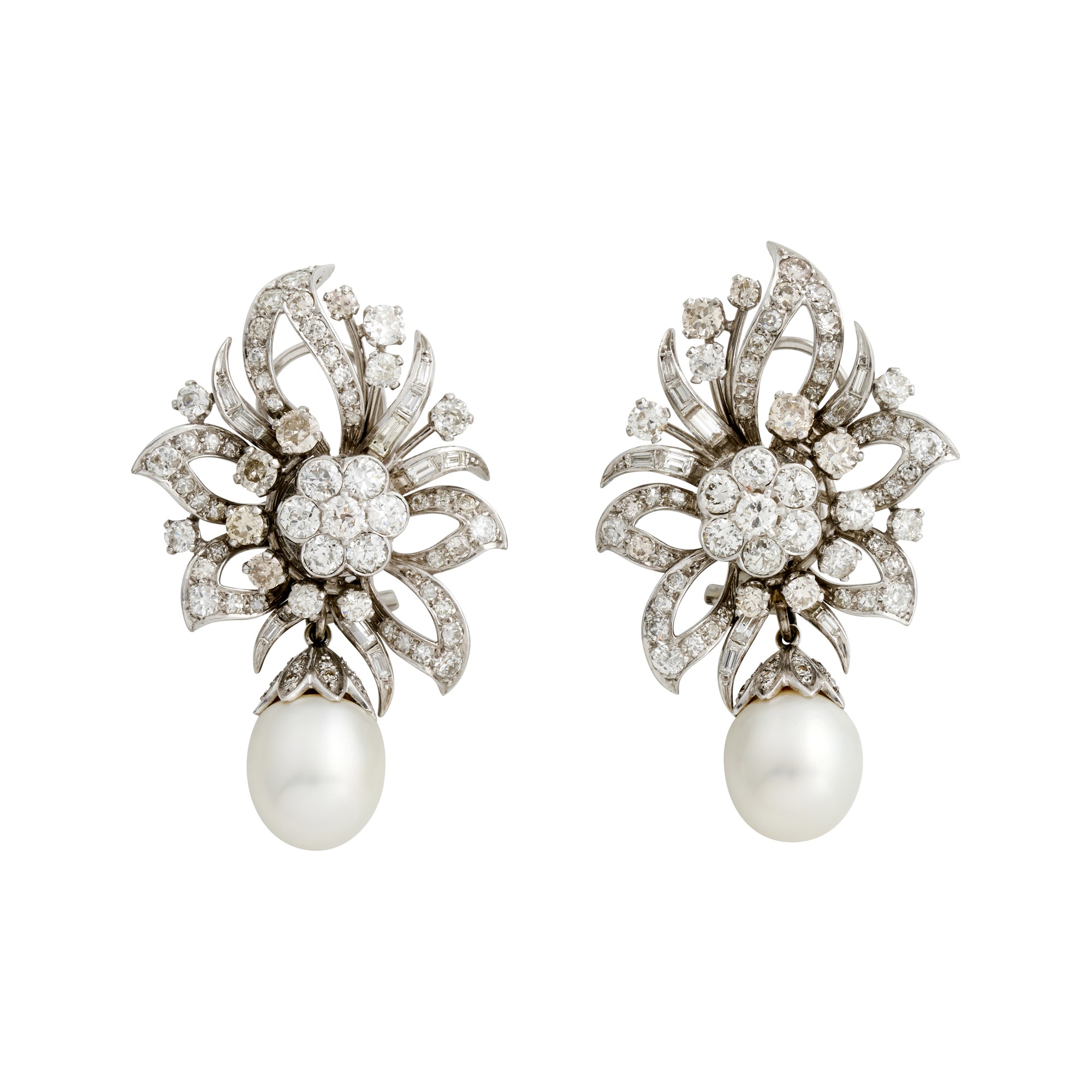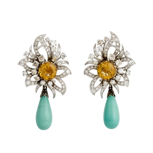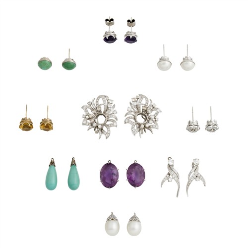 Each comprising folate open work design of diamonds claw-set graduating around central enhancer fitting flanked by ribbons of baguette diamonds and round diamonds. There are nine pairs of additional enhancers comprising drop enhancers of amethysts, turquoise and diamonds, together with central fittings of citrine, pearl, turquoise, amethyst and diamond that can be worn in varying combinations, length approximately 50mm, gross weight approximately 23.8 grams, total gross weight approximately 86.0 grams. (10)