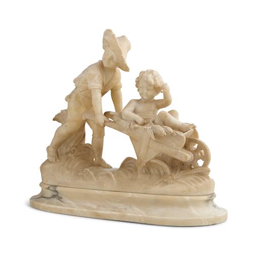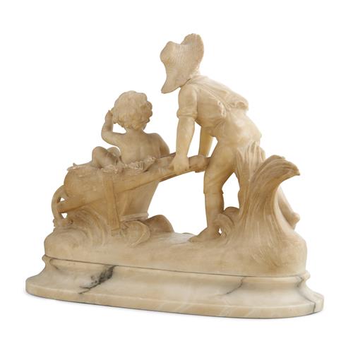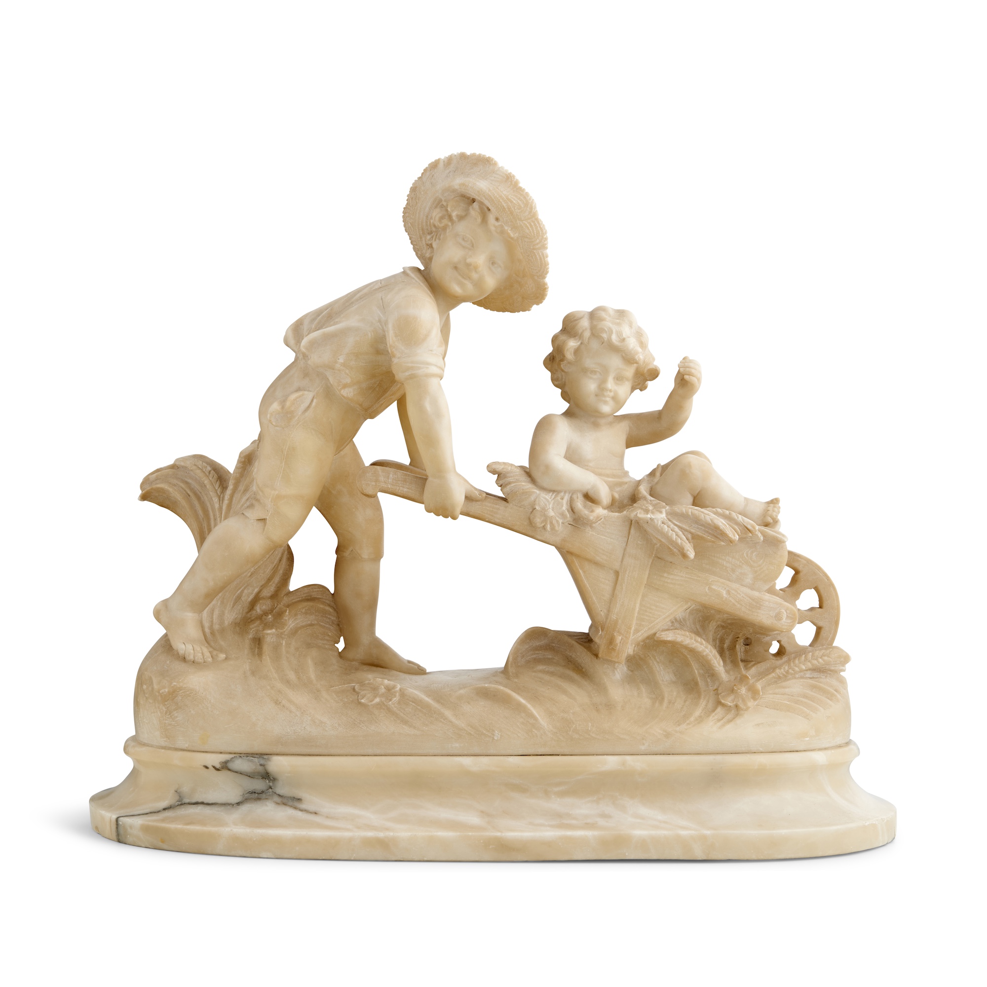 A boy pushing a barrow containing a younger boy and ears of wheat, on an integral plinth