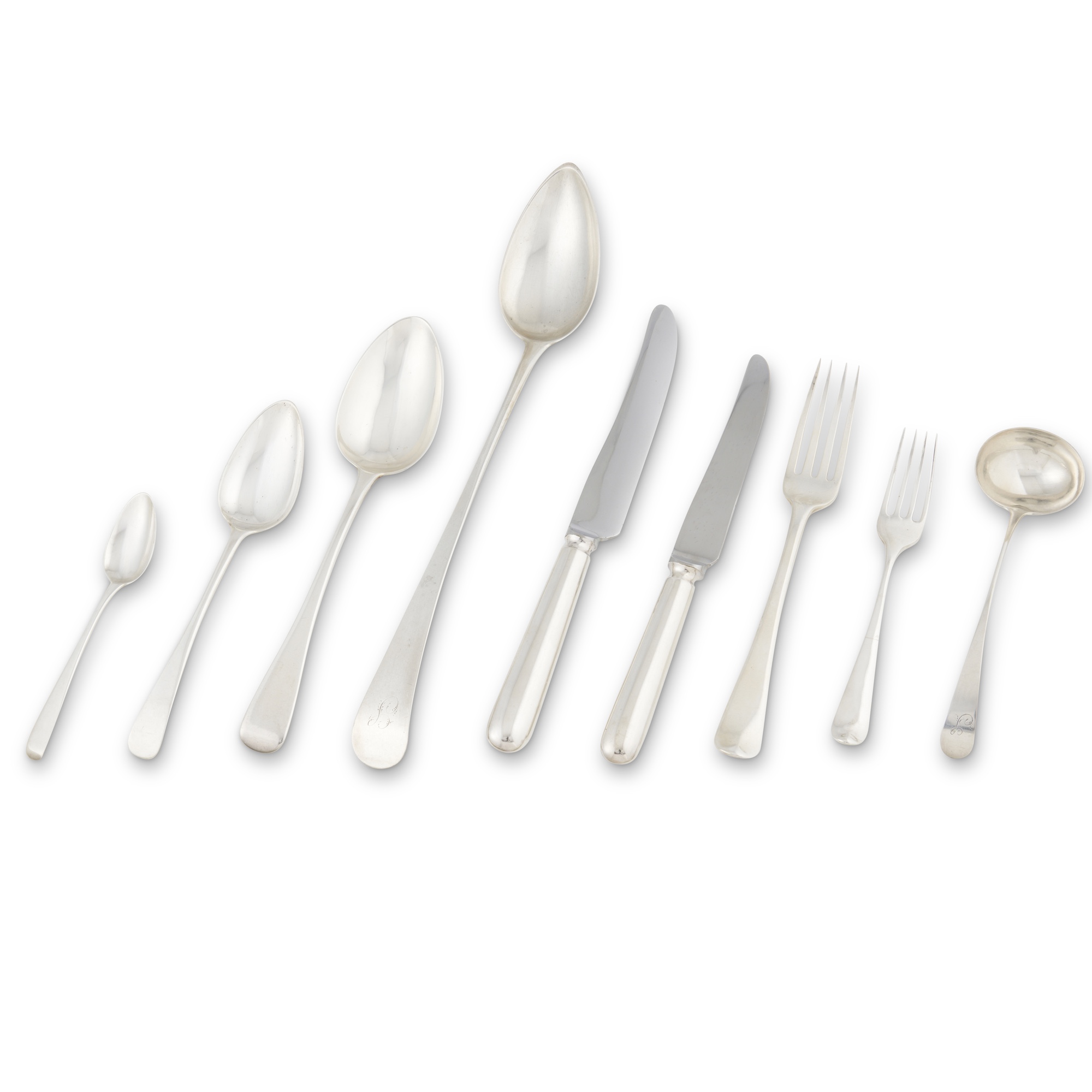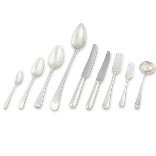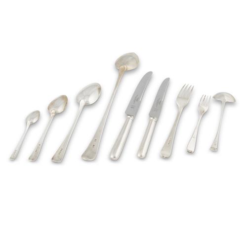 In Old English pattern, a service for twelve, ninety-one pieces, the silver comprising twelve each of table forks, dessert forks, table spoons, and dessert spoons, sixteen tea spoons, a basting spoon, and a pair of ladles, together with a later set of Old English pattern knives in silver plate comprising twelve each of entrée and table knives