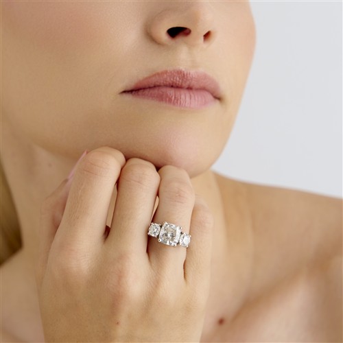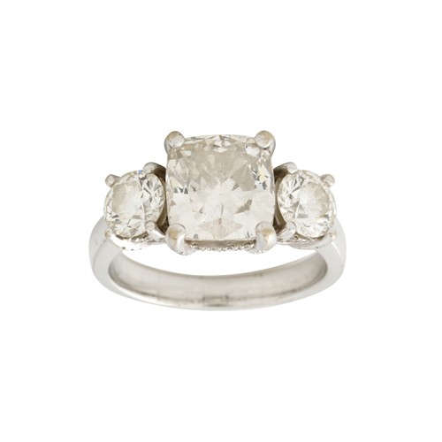 Centring a cushion modified brilliant-cut diamond in claw settings, weighing approximately 3.66 carats, flanked by two round brilliant-cut diamonds set into an open collet with a decorated underbezel of fifty-two round brilliant-cut diamonds to a rounded band, the diamonds together weighing approximately 5.29 carats, size O, gross weight approximately 7.9 grams.