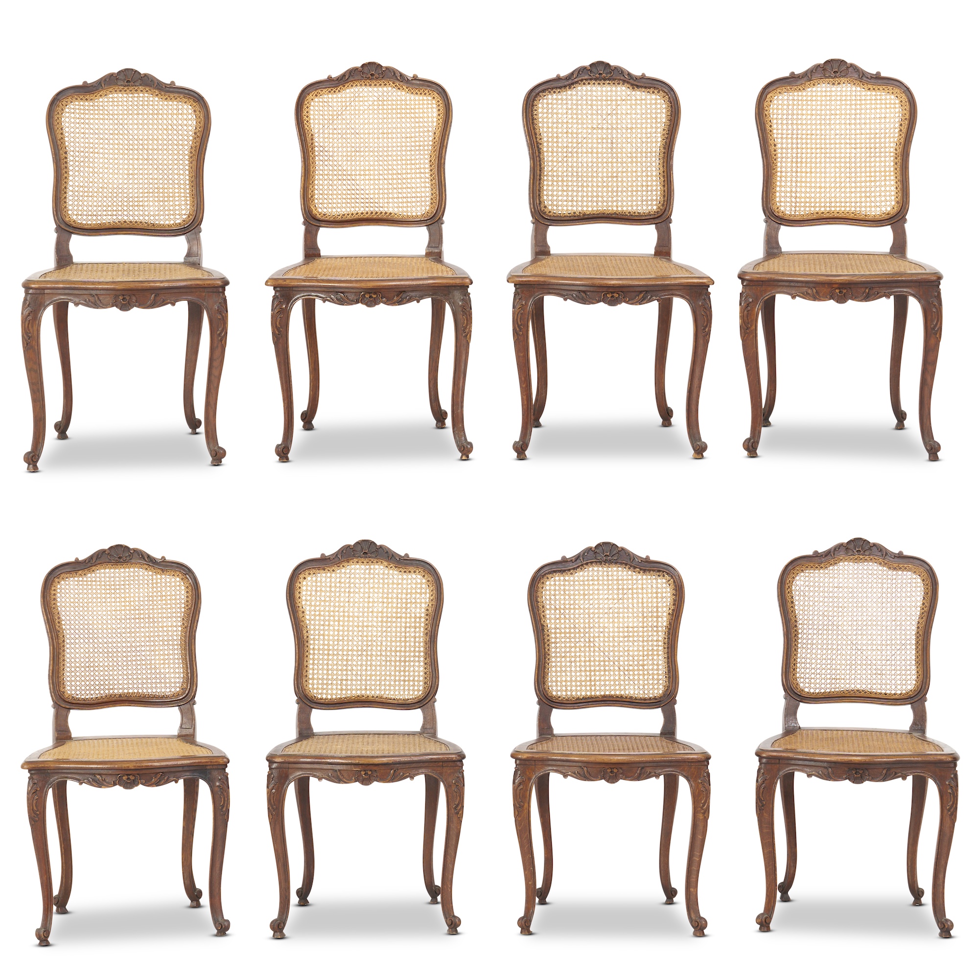 Of typical design with the shaped and caned backs and seats on cabriole supports, the frames moulded and carve with shell centres and foliate knees