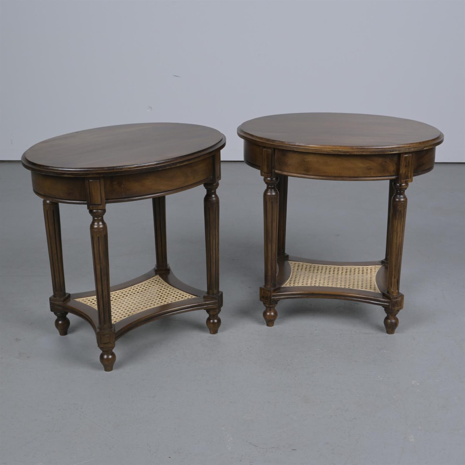 A PAIR OF LOW SIDE TABLES IN ANTIQUE MANNER, WITH CANED UNDERTIERS (58CM H X 60CM W X 45CM D)