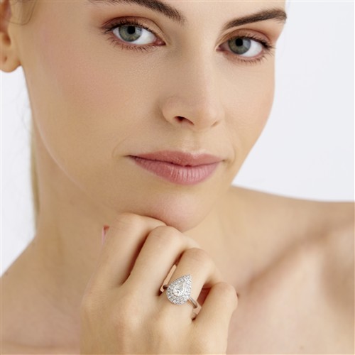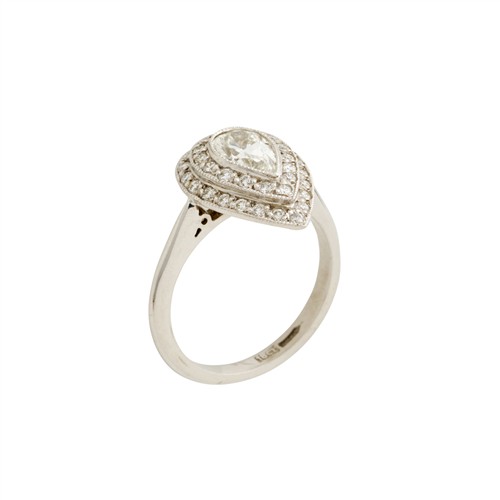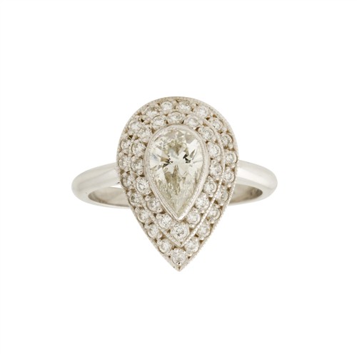 Centring a pear-cut diamond in a rubbed setting with millegrain, weighing approximately 0.92 carats, with upswept shoulders and thirty-seven brilliant-cut diamonds in two tiers, the diamonds together weighing approximately 1.32 carats size M, gross weight approximately 4.5 grams.