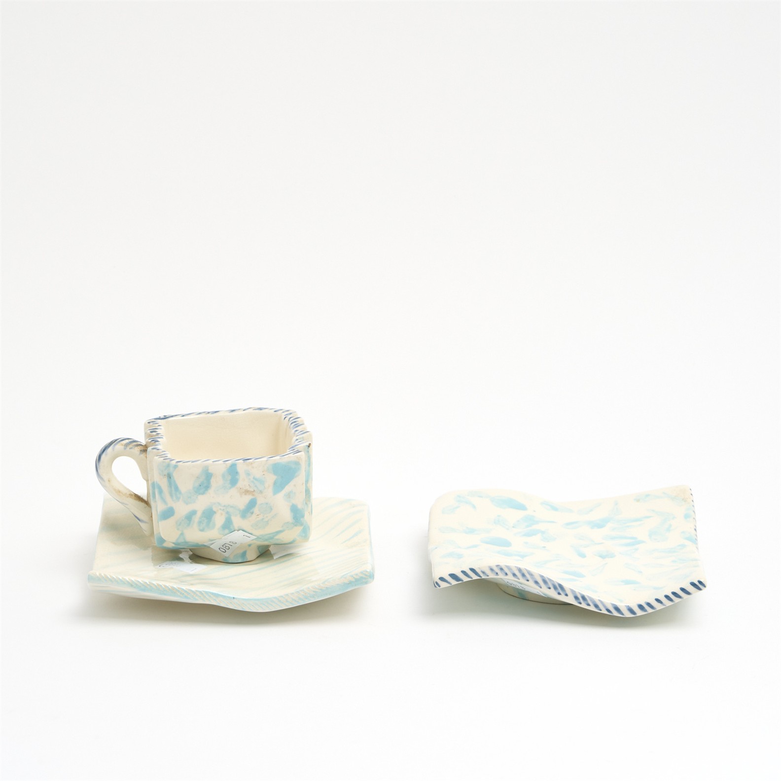 A CAROL MCNICOLL CUP AND SAUCER WITH ONE ADDITIONAL SAUCER W.14CM (LARGEST)