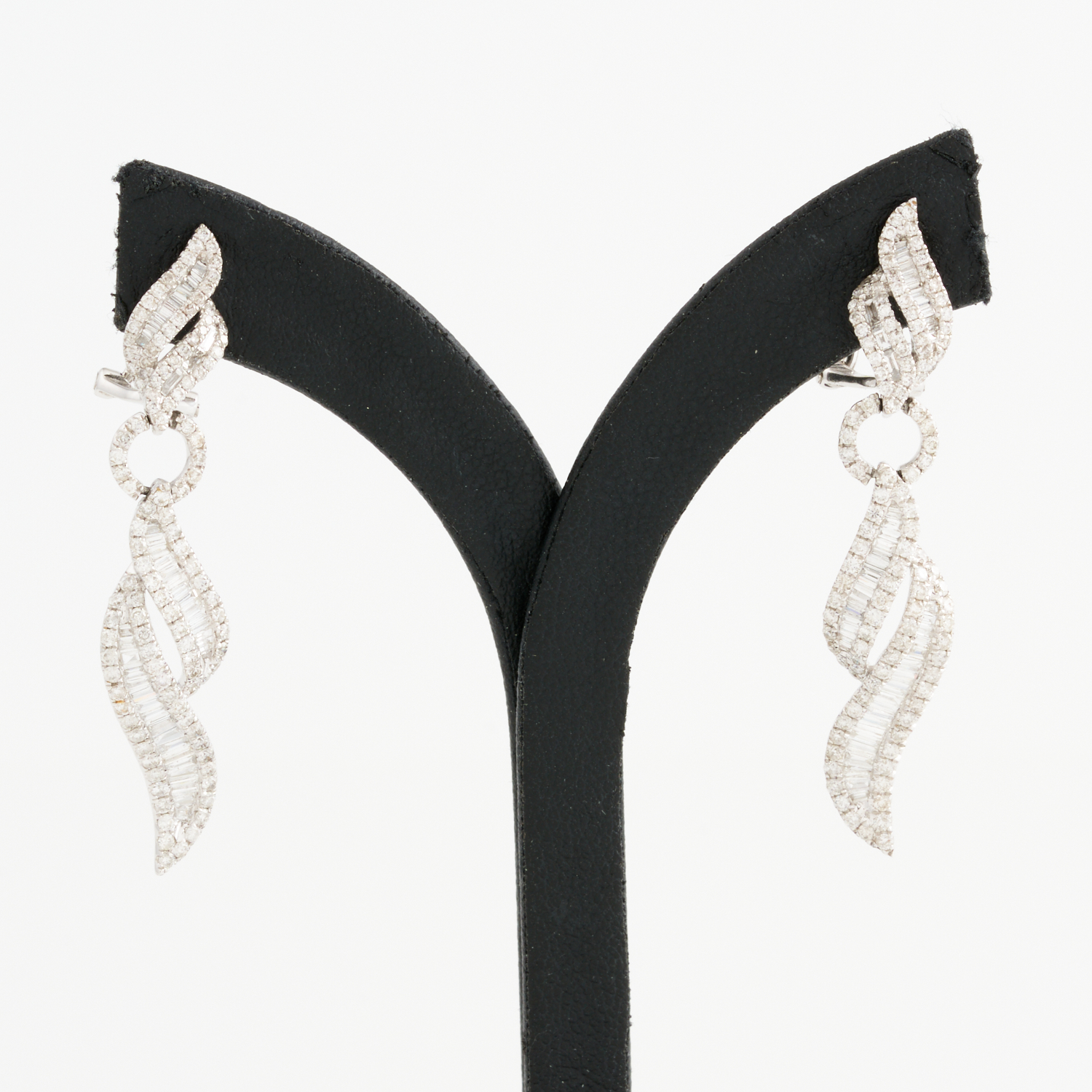 A PAIR OF DIAMOND STUDDED DROP EARRINGS IN 14CT WHITE GOLD TO POST AND CLIP FITTINGS, THE DIAMONDS WEIGHING APPROXIMATELY 2.50 GMS, 45MM TOTAL LENGTH