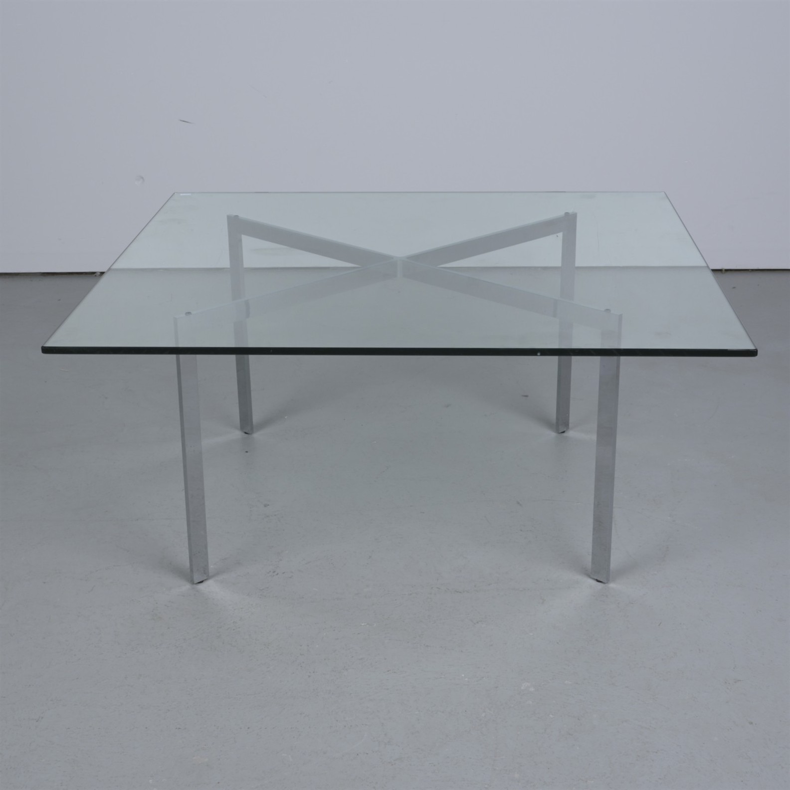 A CHROMED STEEL AND GLASS 'BARCELONA' COFFEE TABLE IN THE MANNER OF MIES VAN DER ROHE (47CM H X 102CM W X 102CM D)