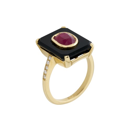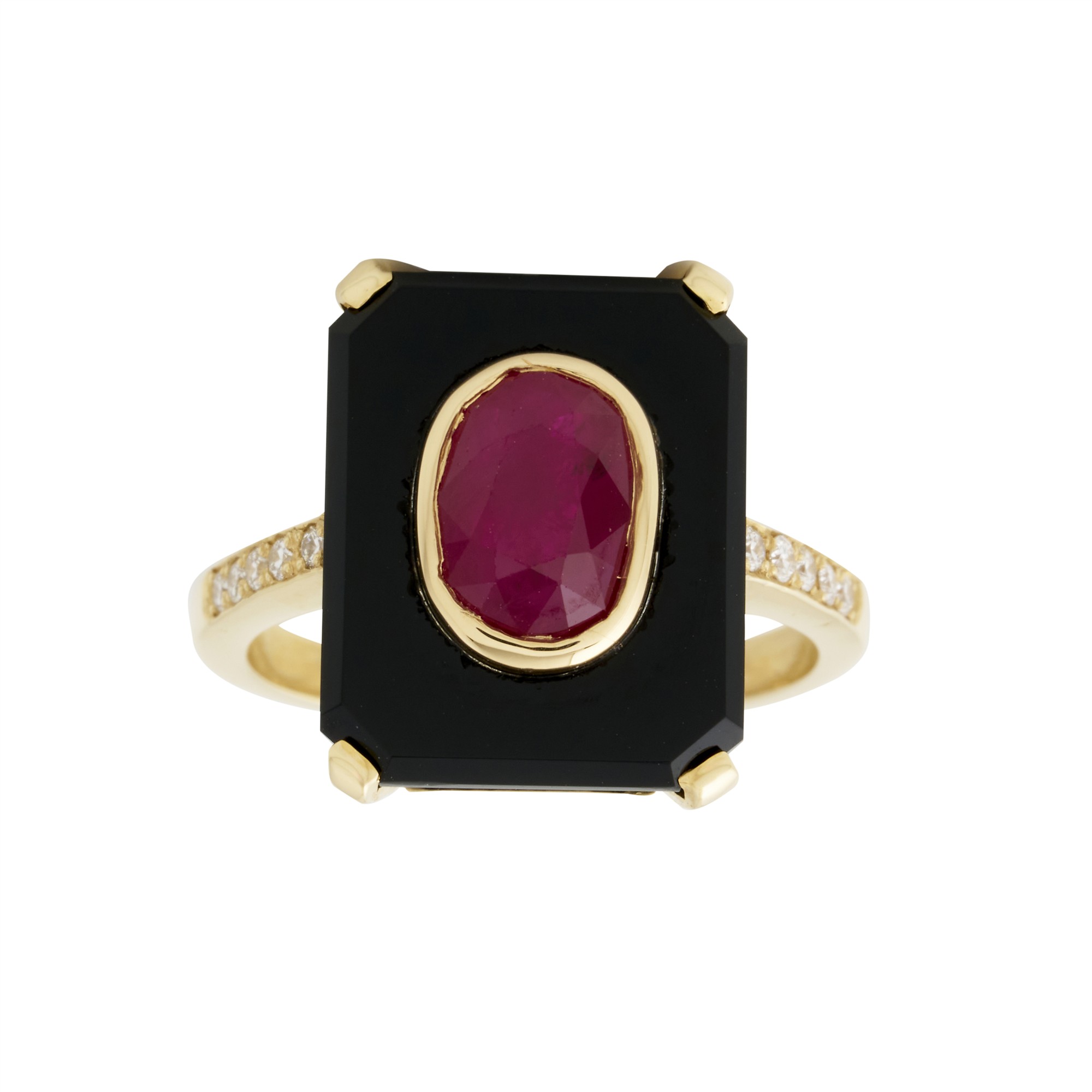 Centring a claw-set rectangular onyx in-set with a bezel-set ruby of approximately 1.88 carats to a claw-set diamond band, the diamonds together weighing approximately 0.10 carats, size M1/2, gross weight approximately 6.4 grams.
