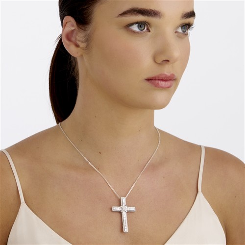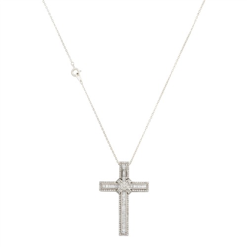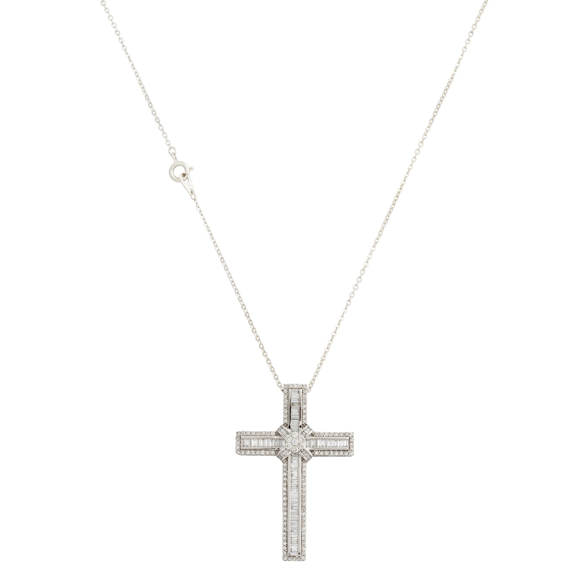 Centring a cluster of six, claw-set round brilliant-cut diamonds above an offset cross of channel set baguette cut diamonds raised on a crucifix of channel set, baguette cut diamonds with a border of claw-set round brilliant-cut diamonds to a hidden bale and silver plated chain with bolt ring, the diamonds together weighing approximately 2.00 carats, length approximately 500mm, pendant length approximately 50mm, gross weight approximately 8.0 grams.