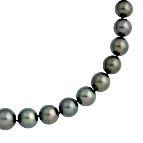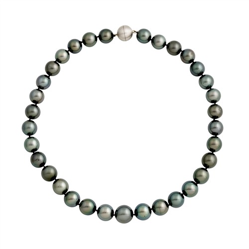 A strand of graduated Tahitian round black pearls with good lustre measuring approximately 12.0mm to 14.5mm, individually knotted to a sterling silver magnetic ball clasp, length approximately 460mm gross weight approximately 100.0 grams.