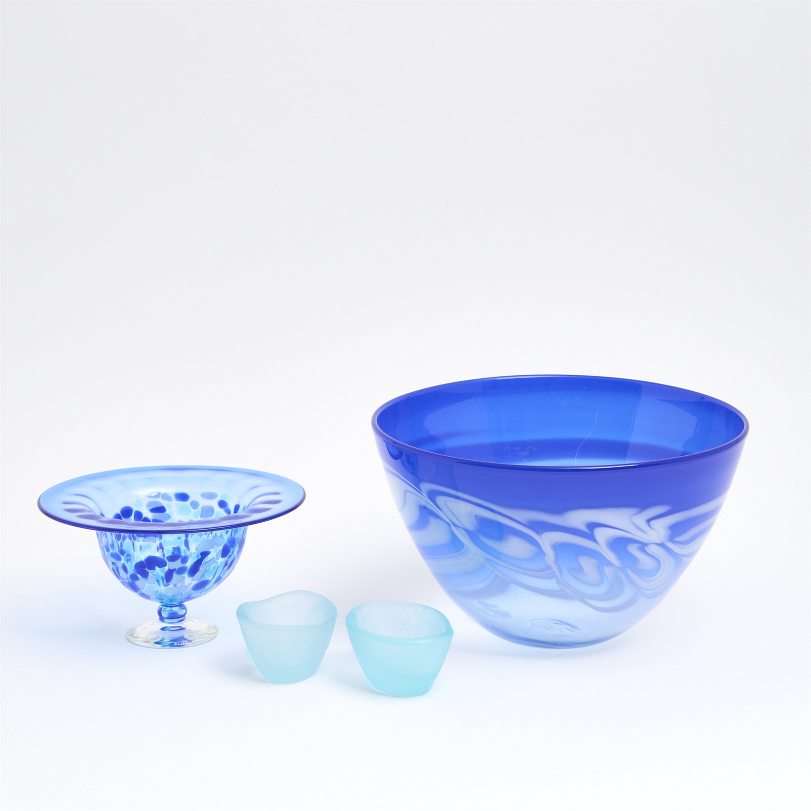 A RANGE OF BLUE AUSTRALIAN ART GLASS BY MEG CASLAKE, DAVID PEDLER, RICHARD MORRELL AND SCOTT SPENCER DIA. 23CM (LARGEST)