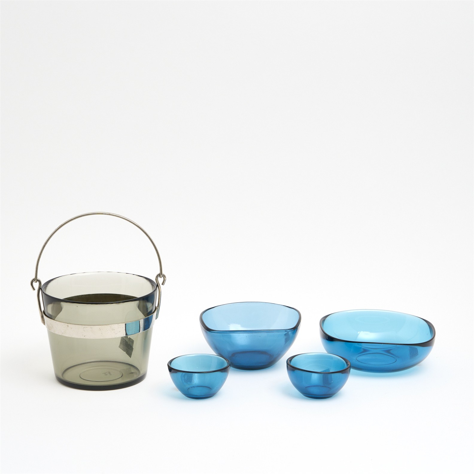 A SET OF ORREFORS FUGA BOWLS AND ICE BUCKET BY SVEN PALMQVIST, MADE IN SWEDEN H.9.5CM (TALLEST)