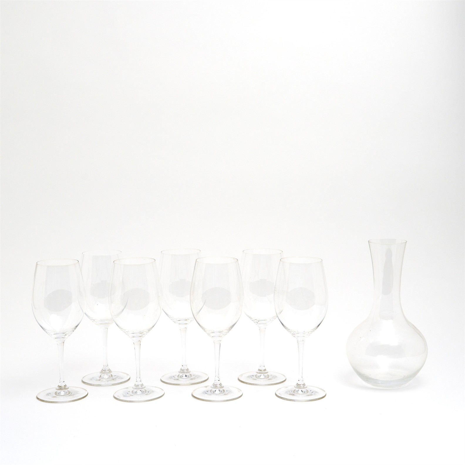 A SET OF SEVEN RIEDEL WINE GLASSES AND DECANTER, MADE IN AUSTRIA H.25CM