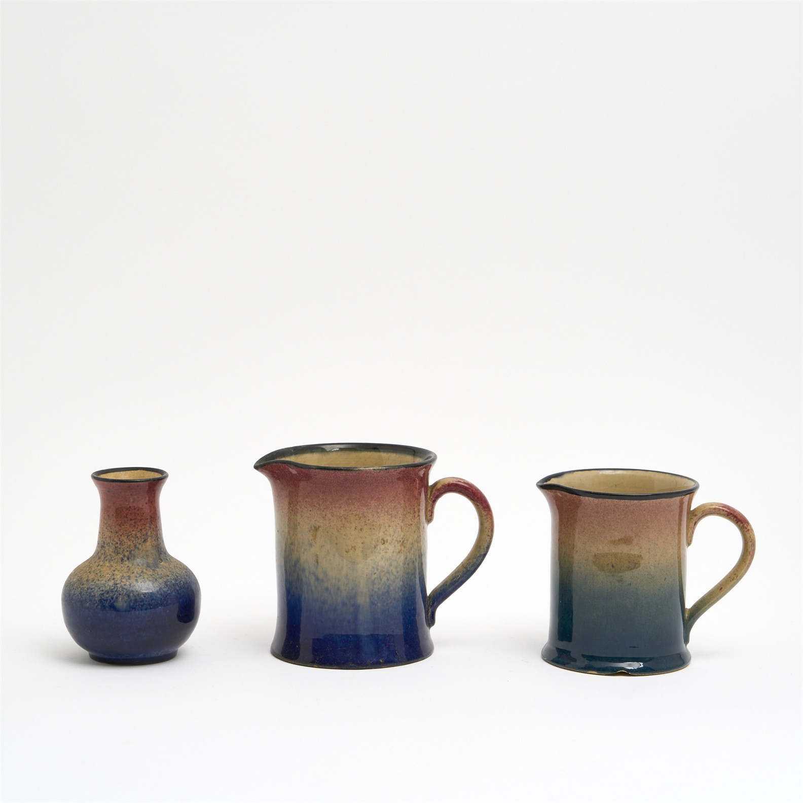 THREE PIECES OF PREMIER POTTERY PRESTON INCLUDING TWO LARGE JUGS AND ONE VASE, ALL WITH SIMILAR GLAZE (A/F) H.12.5CM (TALLEST)
