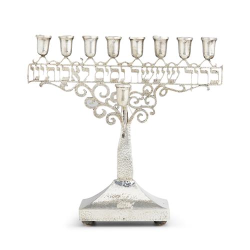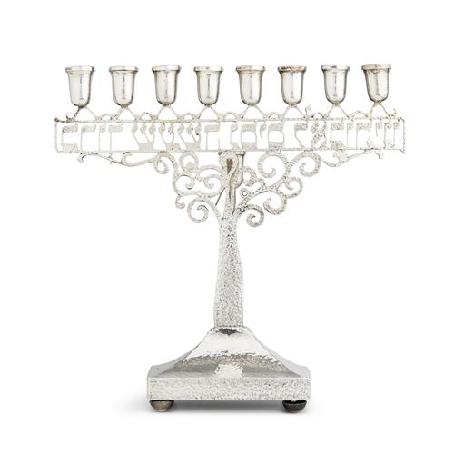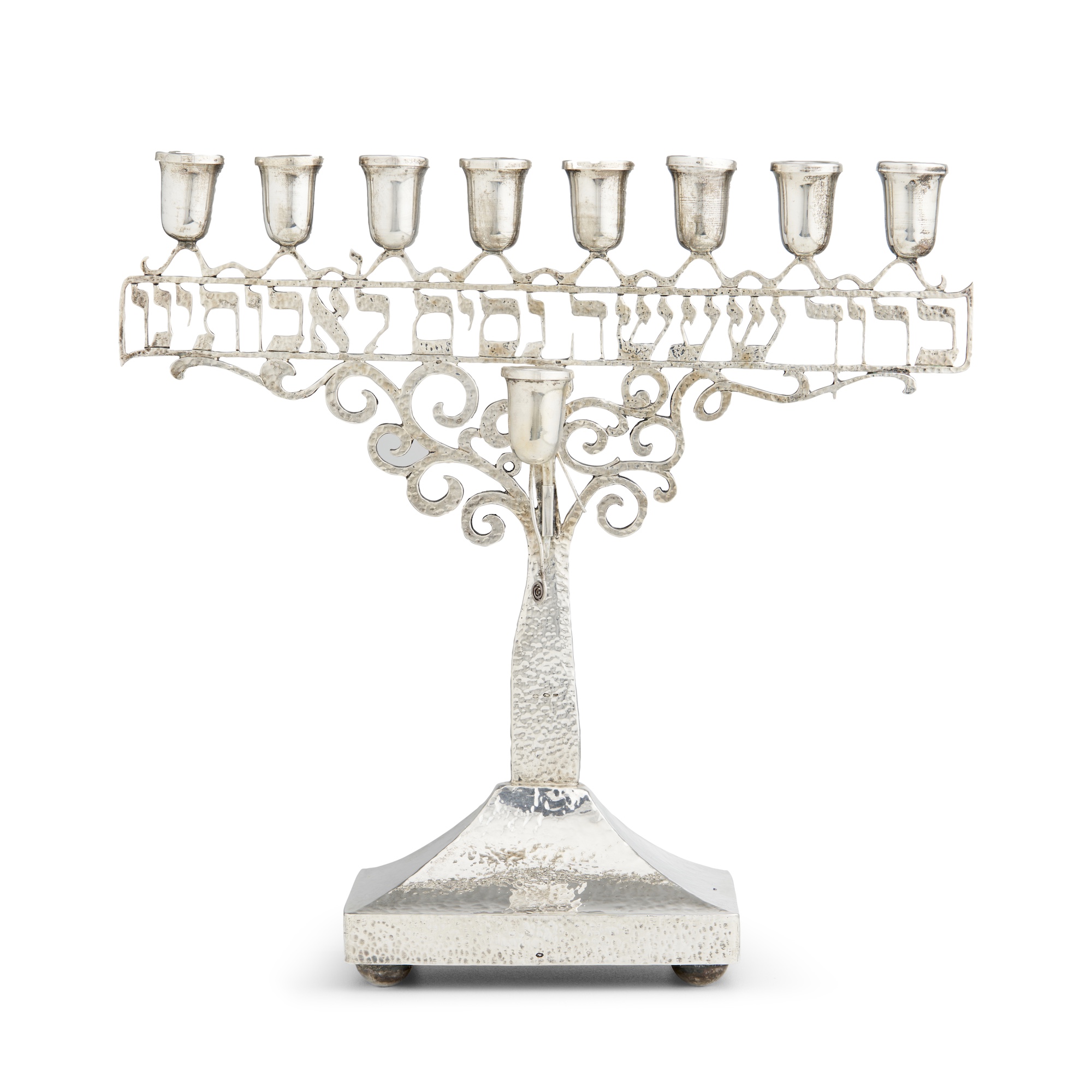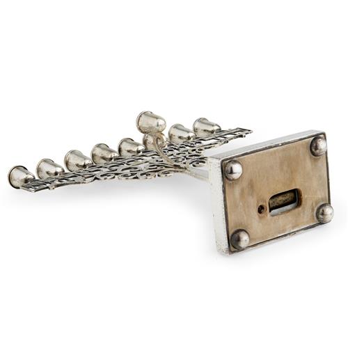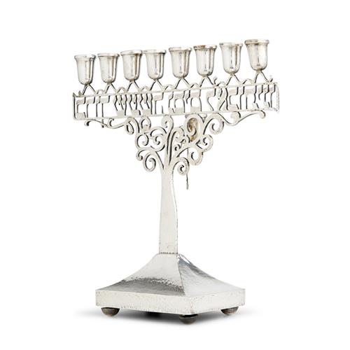 In the flat stylised form of a tree on a spreading rectangular base, the eight lights arranged in a line above an openwork inscription in Hebrew and the shamash mounted to the front, all but the lights planished, the based accommodating a simple mechanical musical movement