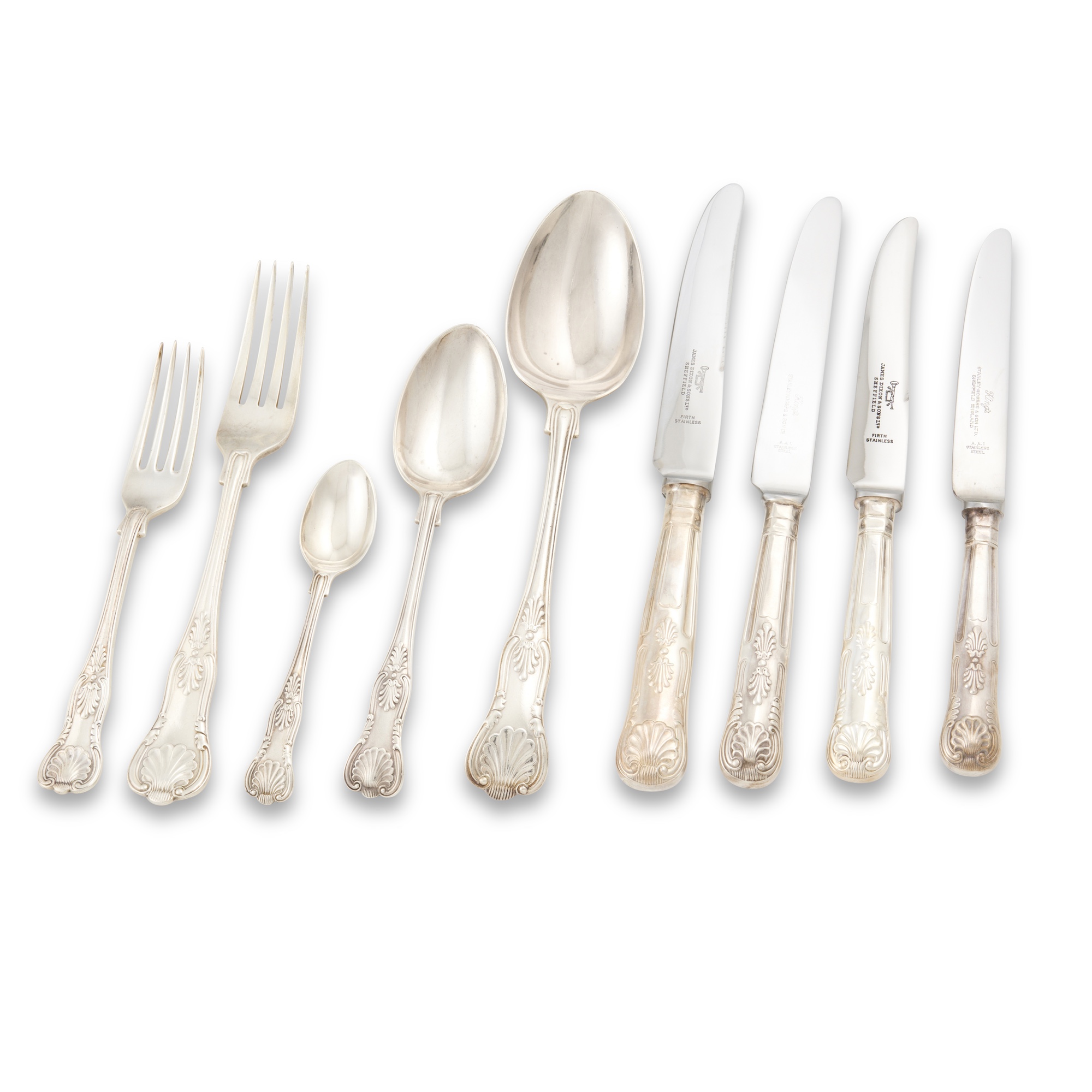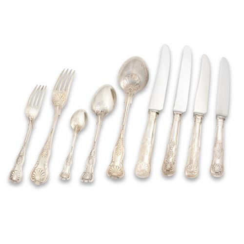 In King's pattern, basically a service for six, fifty-six pieces, the silver comprising six each of entrée and table forks, dessert spoons, and tea spoons, and four serving spoons, together with two later suites of King's pattern knives in silver plate, one suite comprising eight each of entrée and table knives, the other of six each of the same