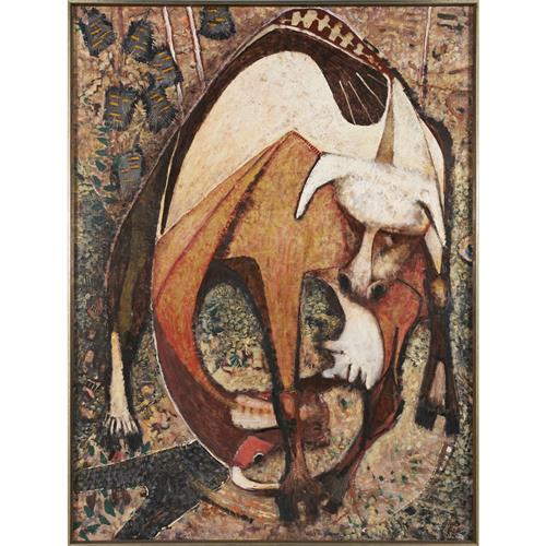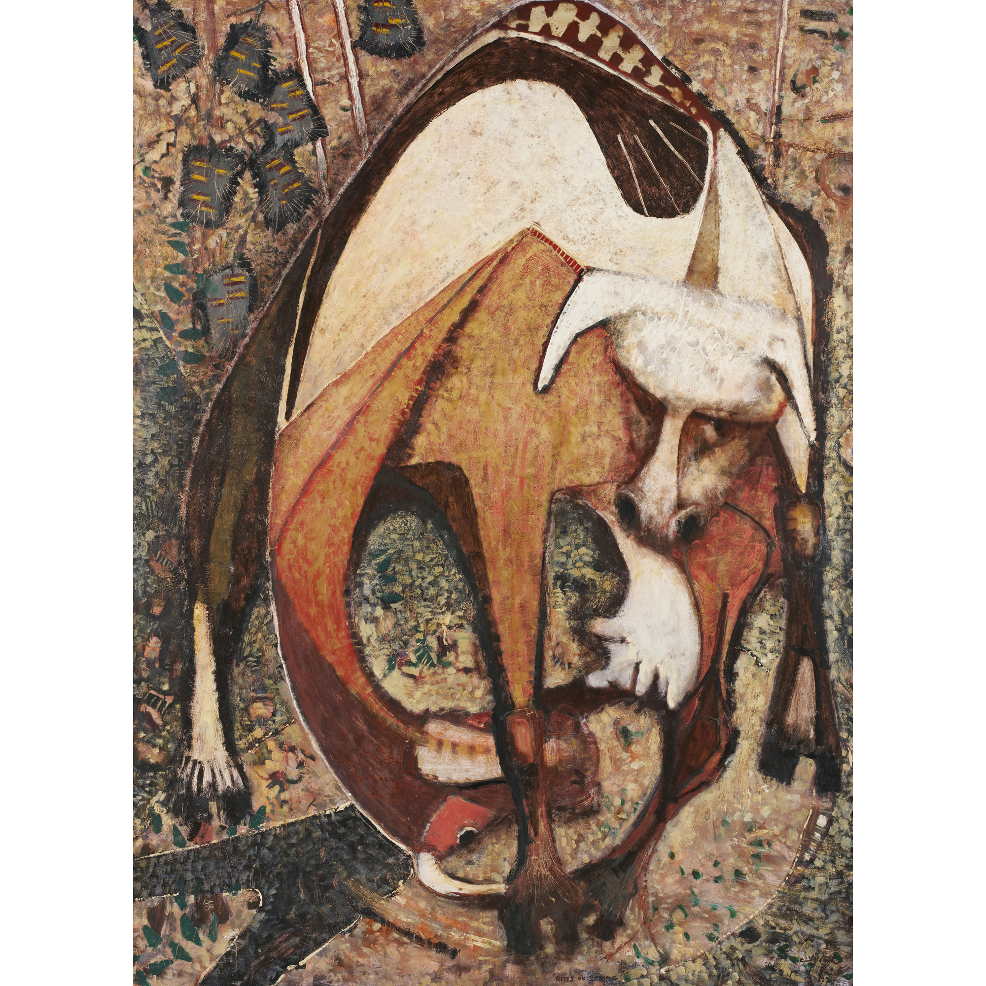 Rites of Spring is a major painting within Clifton Pugh's output, notable for the scale and quality of its execution. The composition is structured around an enclosing, egg-like form, a recurring theme in Pugh's work, which creates a contained yet highly charged pictorial space. The intertwined figures of the bull and cow form a dense, interlocking structure of line and colour, giving the work both physical weight and emotional intensity.