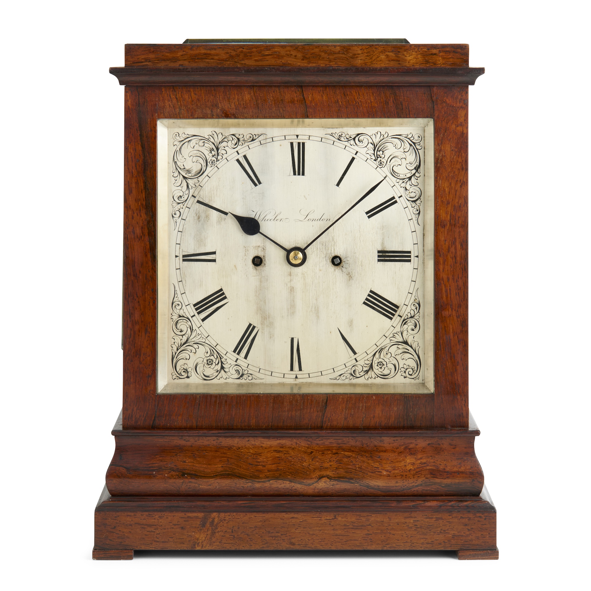 The double fusee movement and silvered Roman numeral dial with engraved spandrels within a five-glass rosewood case of Classical pedestal form with moulded base