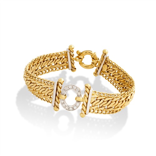 Centring an openwork oval plague pavé-set with brilliant-cut diamonds, the diamonds together weighing approximately 0.20 carats, suspended by a fancy link chain, completed by a bolt ring clasp, mounted in 18ct gold, length 185mm, gross weight approximately 22.6 grams, Italian workshop registration marks.