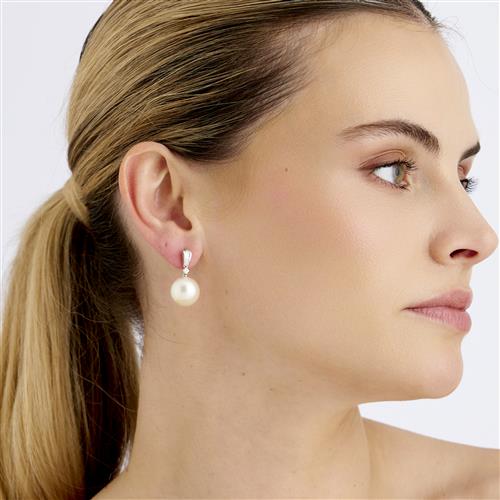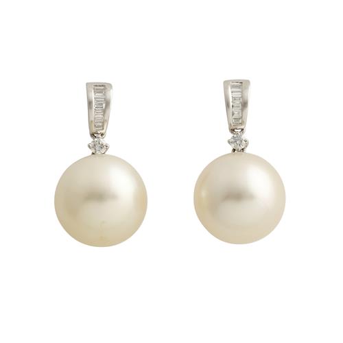 Each comprising a cream to white South Sea pearl of approximately 13.6mm with high lustre, articulated from a claw-set diamond on a graduated fitting of baguette-cut diamonds to a post and clip, the diamonds together weighing approximately 0.26 carats, length approximately 33mm, gross weight approximately 9.5 grams.