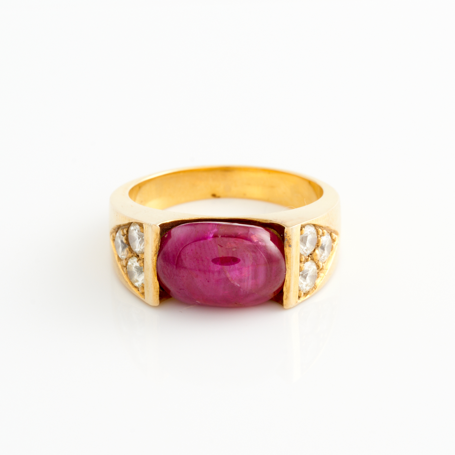 A CABOCHON CUT RUBY AND DIAMOND RING IN 16CT GOLD, SIZE U 1/2, 10.54GMS