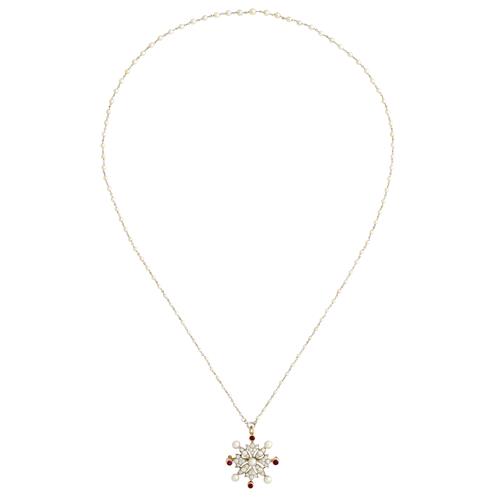 Centring a cultured pearl within a star brooch with rubies and diamonds, the diamonds to a pin and retractable hidden bale with a seed pearl necklace,