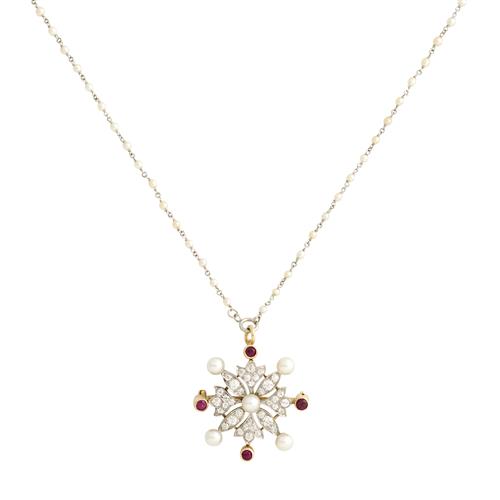 PLATINUM, DIAMOND, RUBY AND PEARL BROOCH / PENDANT, BELLE EPOQUE AND PLATINUM AND SEED PEARL NECKLACE