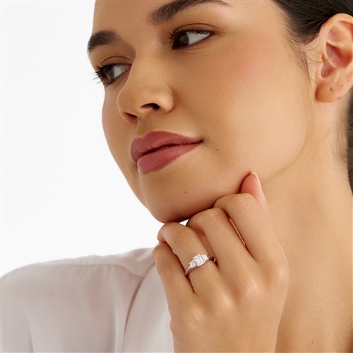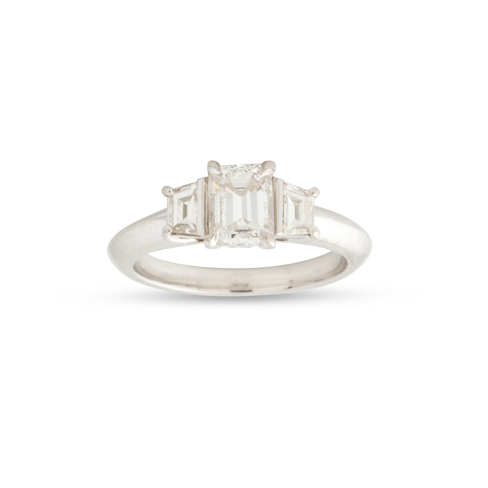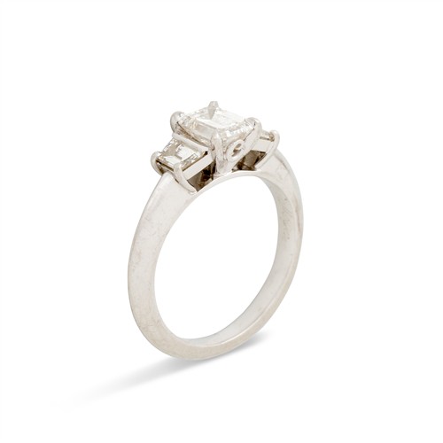 Centring a claw-set emerald-cut diamond weighing 0.78 carats, flanked by claw-set trapezoid-cut diamonds, together weighing approximately 0.41 carats, mounted in platinum, size I1/2, gross weight approximately 6.0 grams, signed Calleija.