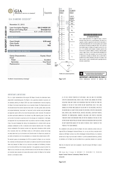 a facsimile GIA report (gia.edu/report-check-landing) numbered 2146281101 dated 21 November 2012, stating that the 0.78 carat diamond is natural, D colour, VS2 clarity;