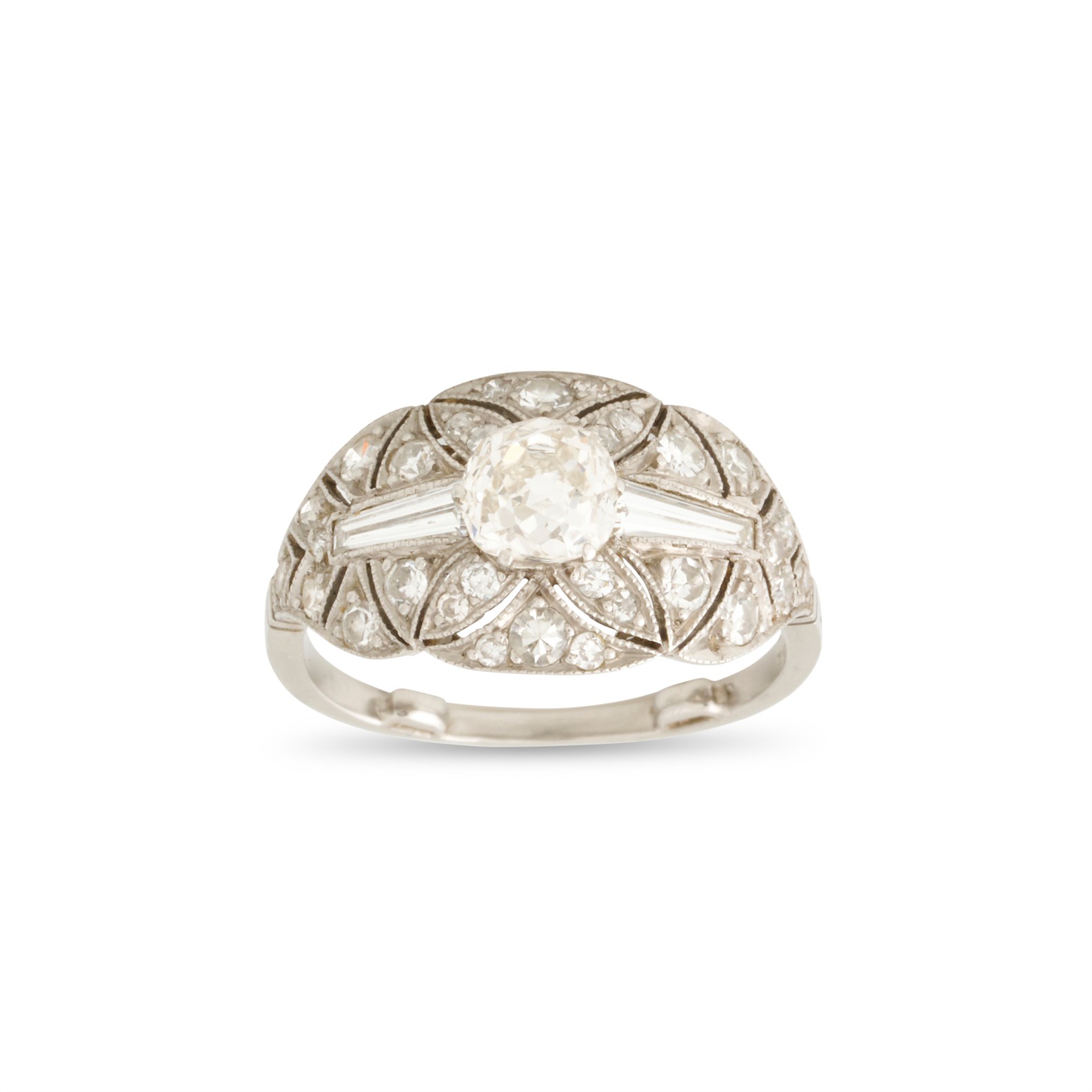 Centring a claw-set old mine-cut diamond, stated to weigh 0.78 carats, flanked by collet-set tapered baguette diamonds, to ornate pierced surround millegrain-set with single-cut diamonds, the small diamonds together weighing approximately 0.30 carats, mounted in platinum, size K1/2, gross weight approximately 3.9 grams.