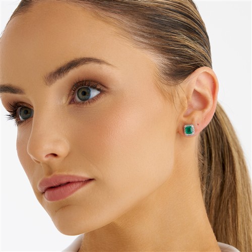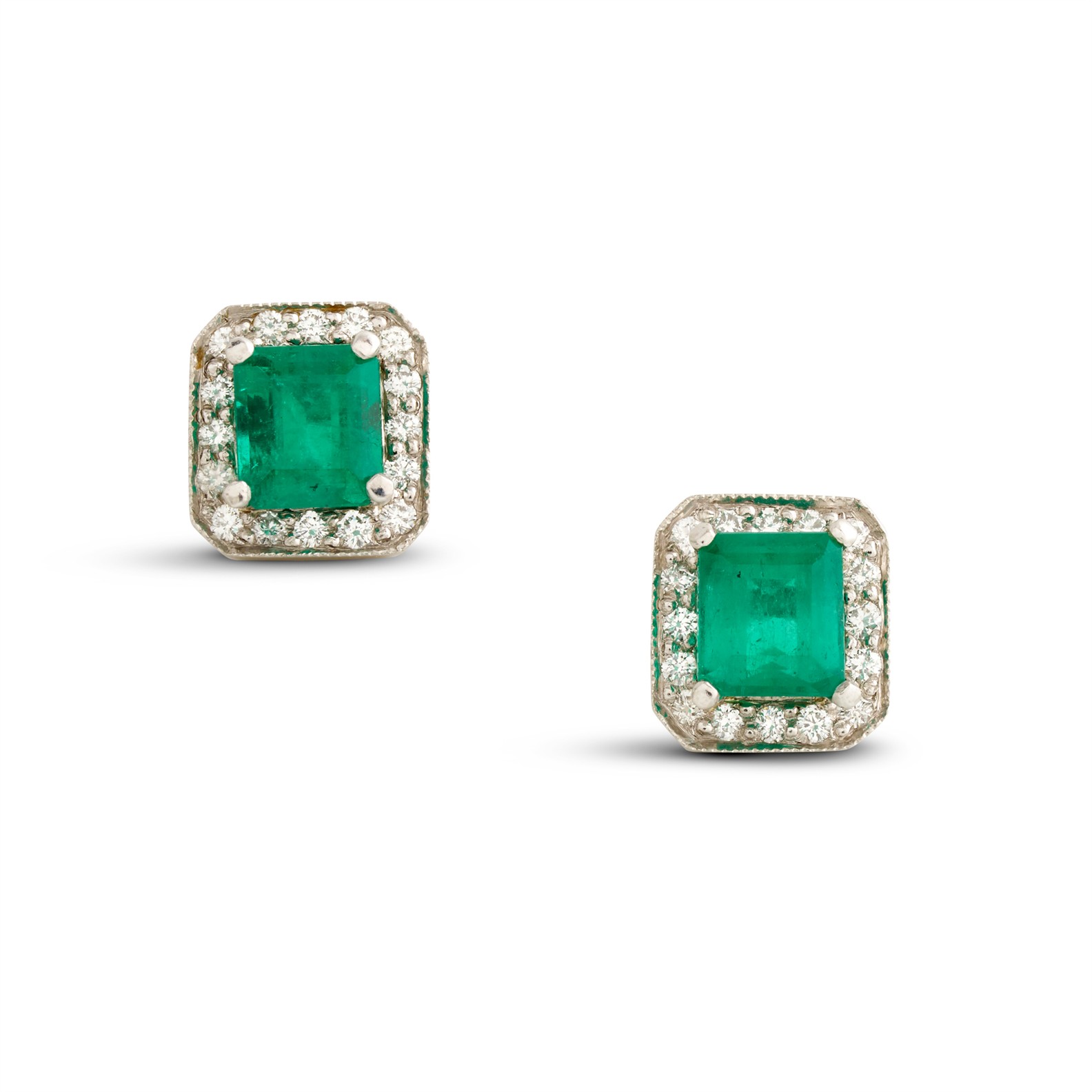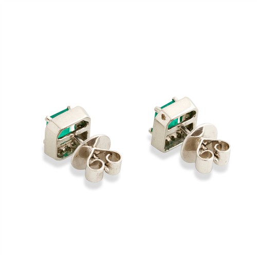 Each of cluster design, centring a claw-set emerald-cut emerald, framed by a halo of pavé-set brilliant-cut diamonds, the emeralds and diamonds together weighing approximately 1.74 carats and 0.30 carats respectively, mounted in platinum, post and scroll fittings, length 9mm, gross weight approximately 6.8 grams.