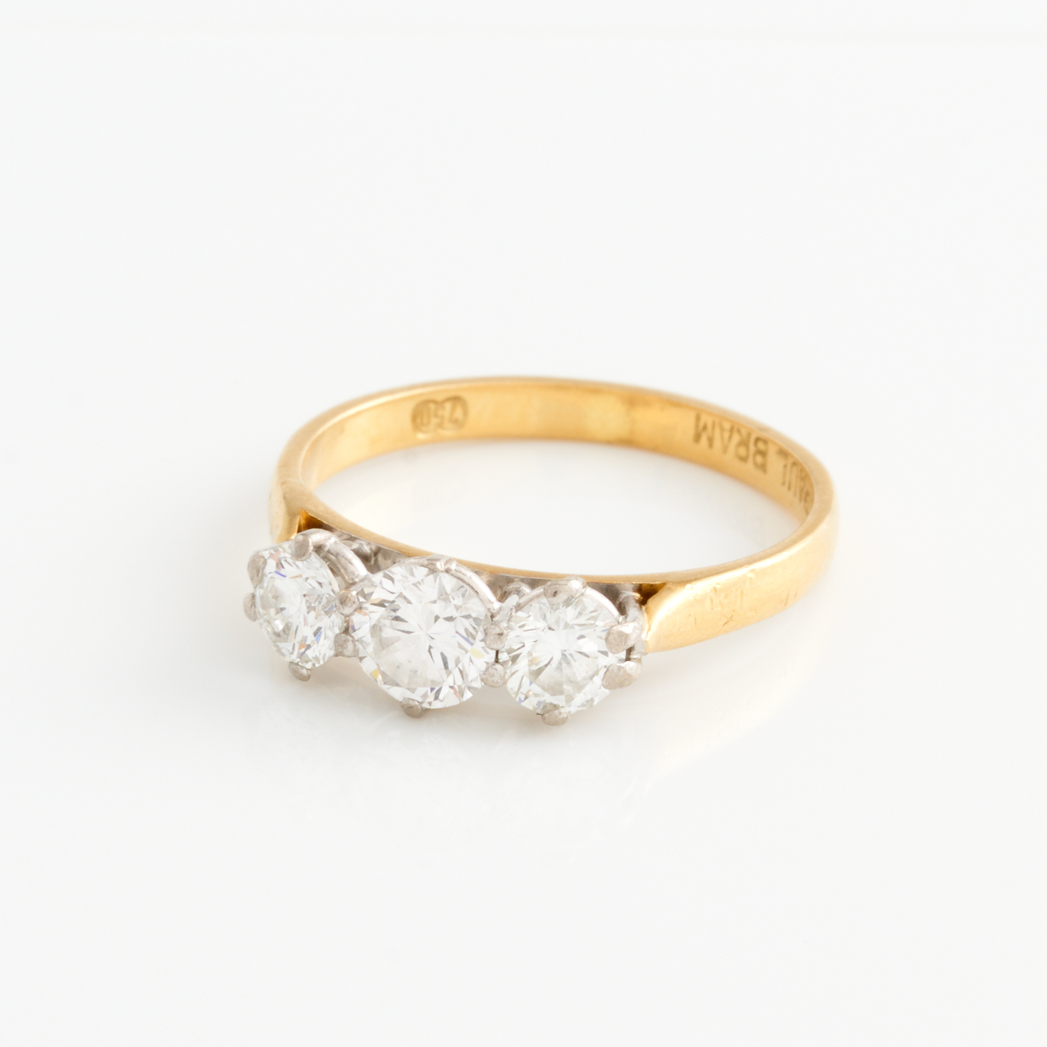 Centring a classical claw-set round brilliant-cut diamond of approximately 0.50 carats flanked by two further claw-set round brilliant-cut diamonds to a sweep shoulder and rounded band, together the diamonds weighing approximately 0.96 carats, size J, gross weight approximately 3.0 grams.