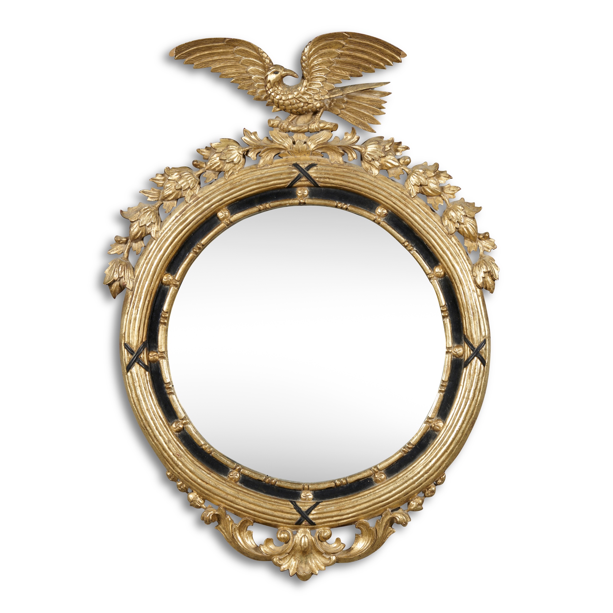 The circular plate in a gilt and ebonised reeded frame surmounted with a crest of an outspread bird on a bell flower garland