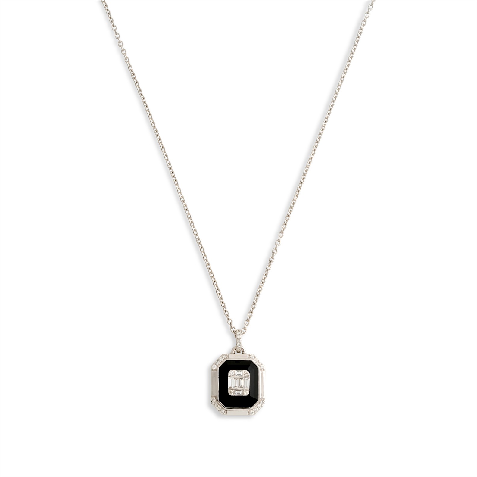 Centring a cluster of pavé and collet-set baguette and brilliant-cut diamonds within a bevelled plaque of onyx, the corners embellished with brilliant-cut diamonds, surmounted by a similarly set bale, suspended by a fine chain, the diamonds together weighing approximately 0.34 carats, mounted in 18ct white gold, inner circumference 400mm, pendant length 22mm, gross weight approximately 7.2 grams.