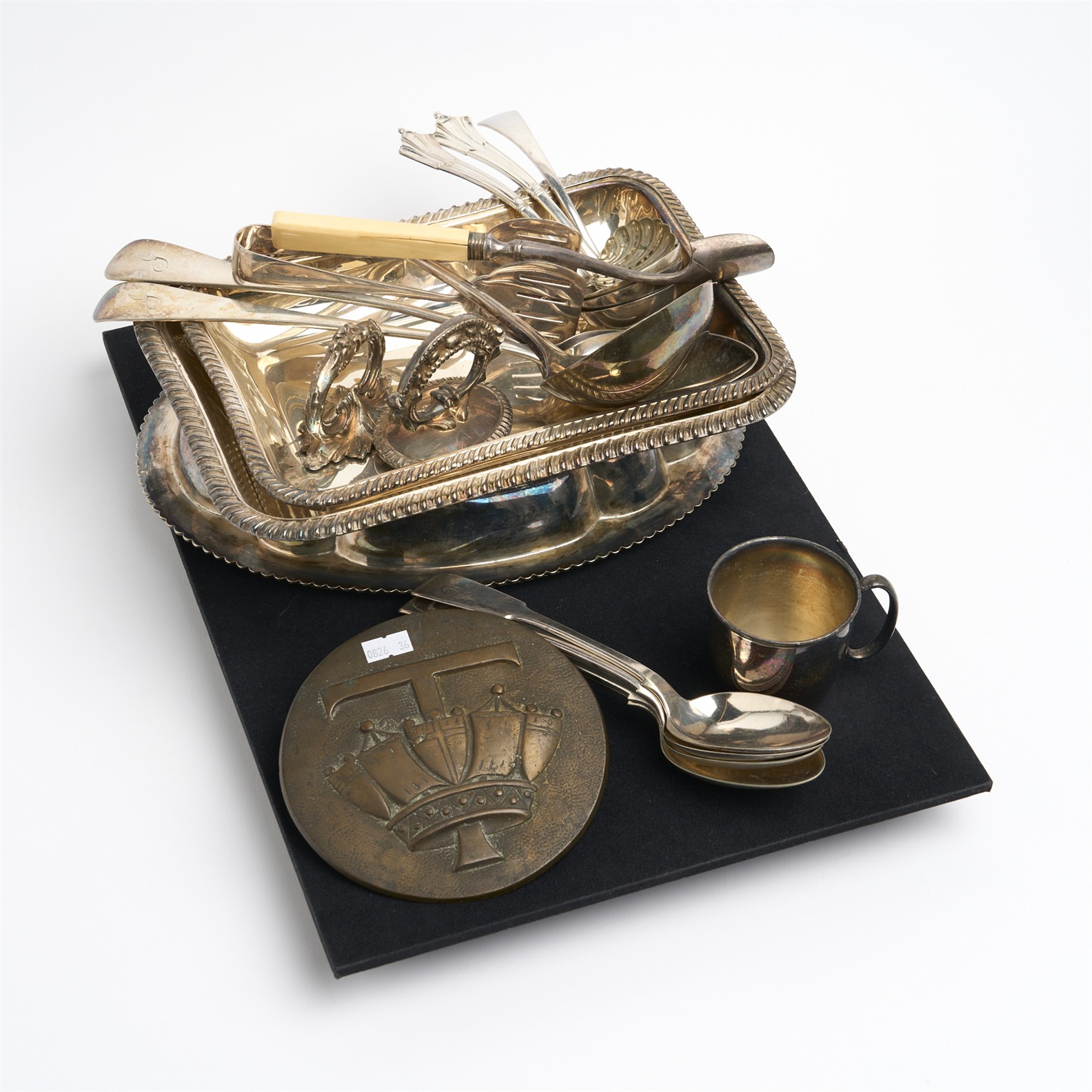 A COLLECTION OF DECORATIVE SILVER PLATE INCLUDED TWO TUREENS, CUTLERY AND SERVING WARE, TOGETHER WITH A REPLICA MEDAL DIA.15CM (MEDAL)