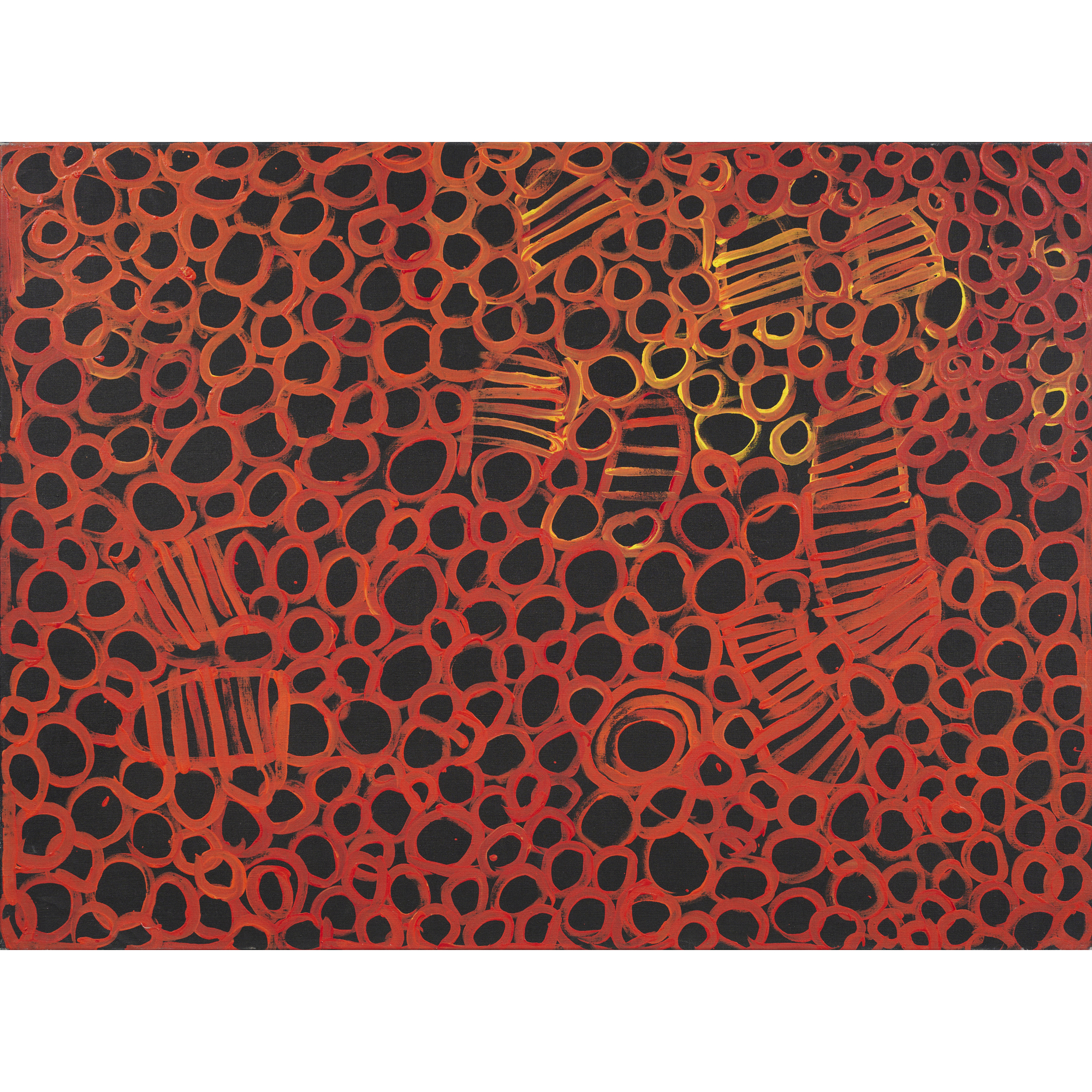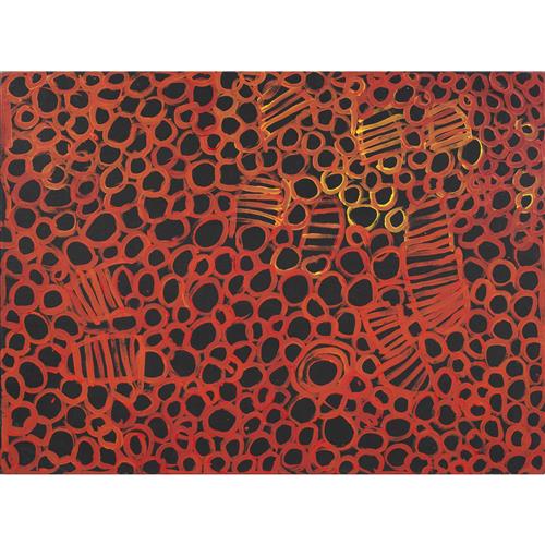 Minnie's Dreamings consist of elements of 'Bush Melon' and 'Bush Melon seed'. 'Bush Melon' is depicted using a linear design of curves, circles and breast designs in different colours creating a very loose and bold design while 'Bush Melon Seed' is big and small patches of colour strewn across the canvas.