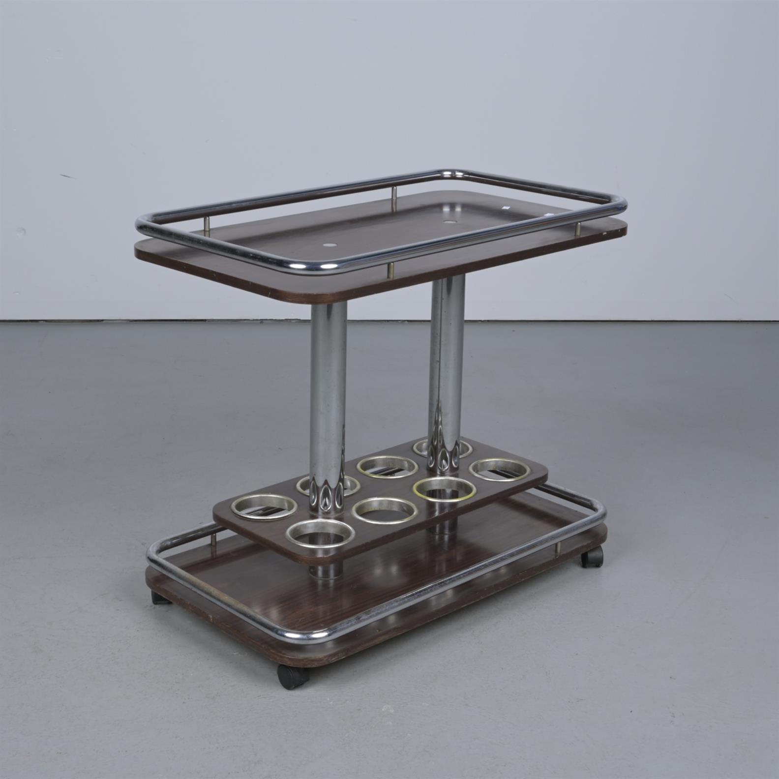 A 1970S CHROME AND WALNUT DRINKS TROLLEY (70CM H X 80CM W X 47CM D)