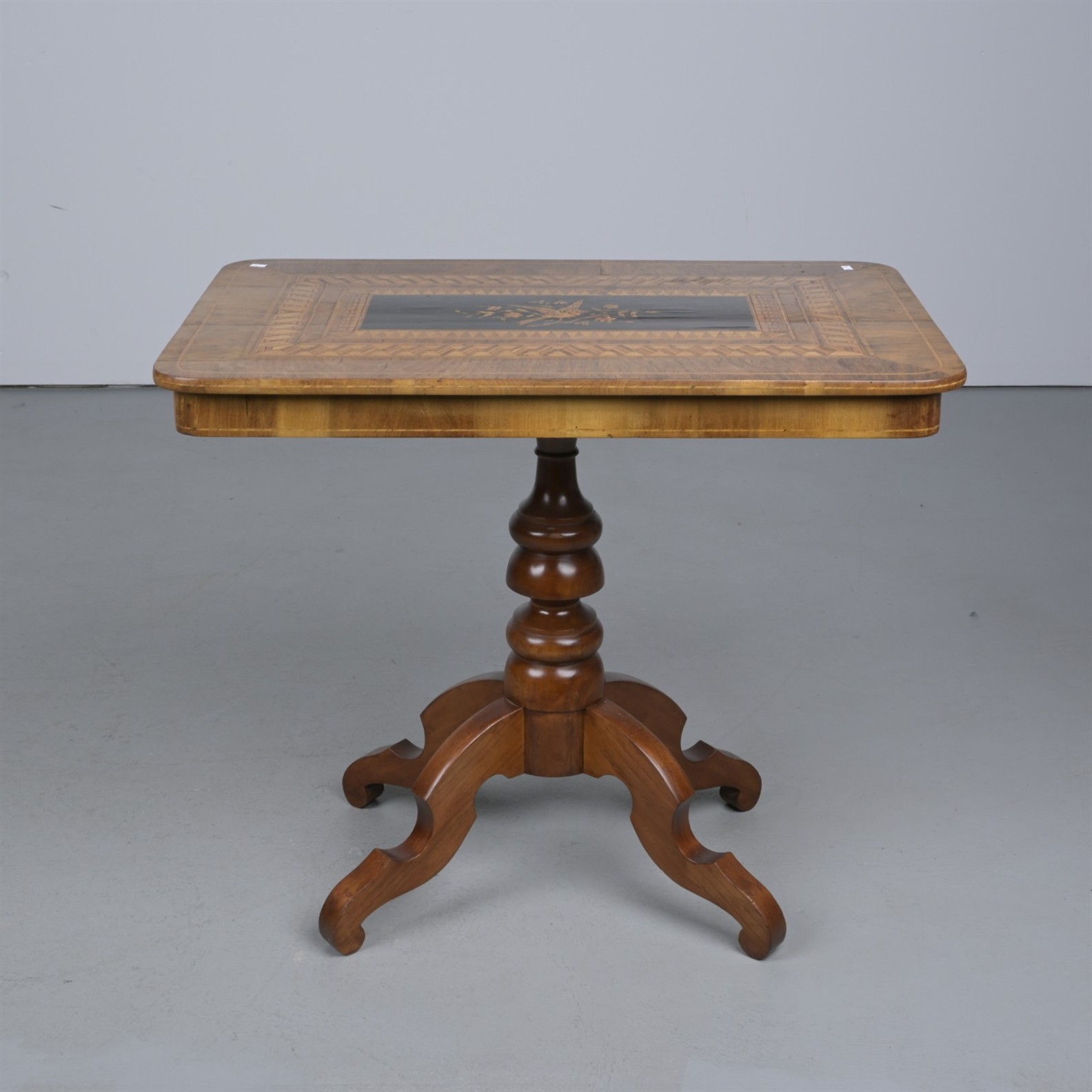 AN ENGLISH WALNUT AND TUNBRIDGEWARE TILT-TOP OCCASIONAL TABLE (A/F) (EVIDENCE OF WOODWORM) (78CM H X 91CM W X 60CM D)