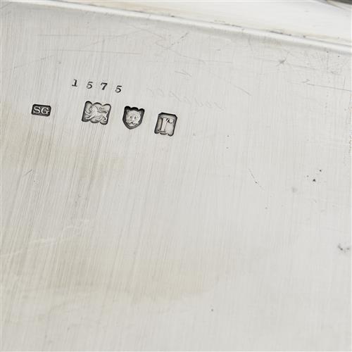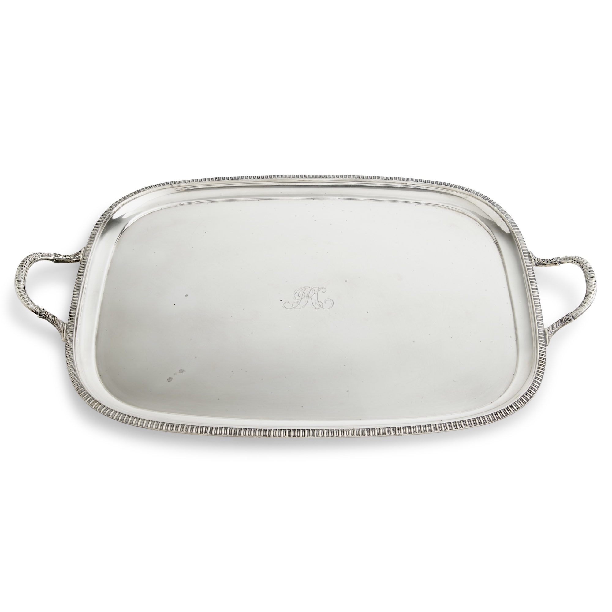 Rounded rectangular with raised sides, the edges and handles gadrooned, the centre engraved with a cipher