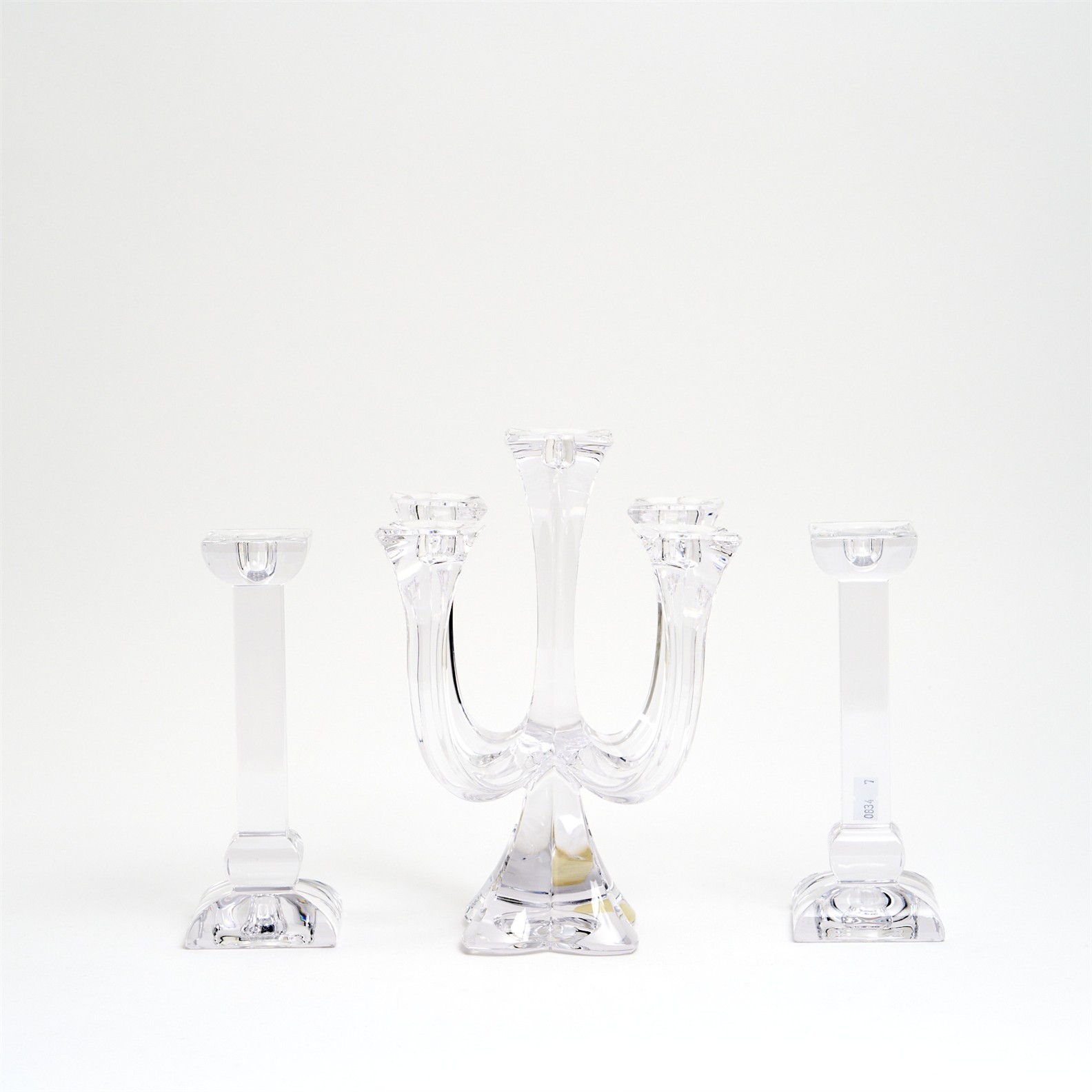 A VILLEROY AND BOCH CRYSTAL FIVE-BRANCH CANDELABRA TOGETHER WITH TWO VILLEROY AND BOCH CANDLE HOLDERS, H. 25CM (TALLEST)