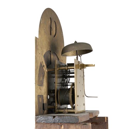 The eight-day movement with anchor escapement striking on a bell, the silvered Roman numeral dial with subsidiary seconds and calendar dials within foliate brass spandrels, the glazed hood with shaped top (formerly with finials) and an arched and moulded cornice above flanking brass-mounted Corinthian columns, the trunk of typical form with a door with shaped top above the moulded plinth base on shaped bracket feet