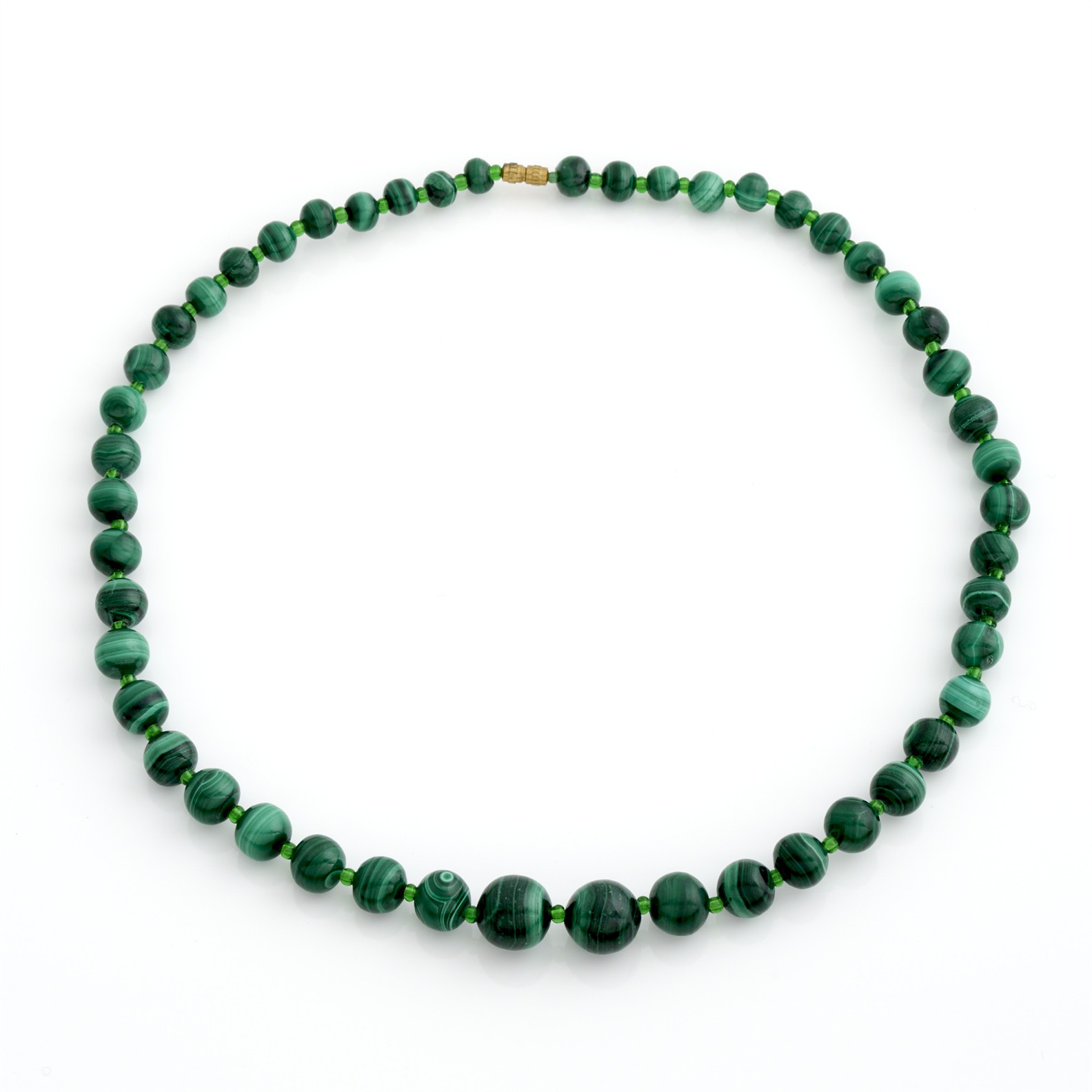 A MALACHITE BEAD NECKLACE TO TWIST CLASP IN GOLD TONED METAL, TOTAL LENGTH 500MM