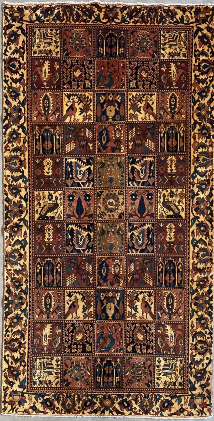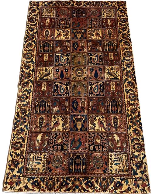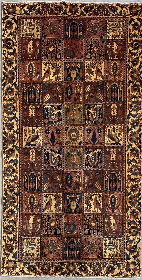 NOMADIC WEAVE FROM THE CHAHARMAHAL VA BAKHTIARI PROVINCE WITH PERSIAN GARDEN DESIGN OF SQUARE PANELS CONTAINING GARDEN THEMES OF CYPRESS TREES, URNS BEARING FLORAL FOLIAGE, PRAYER NICHES, FLORAL PAISLEY MOTIFS & BIRD & PEACOCK FORMS.