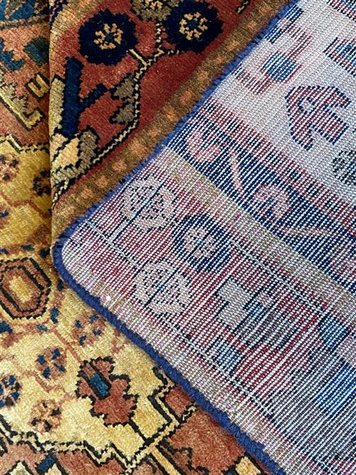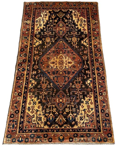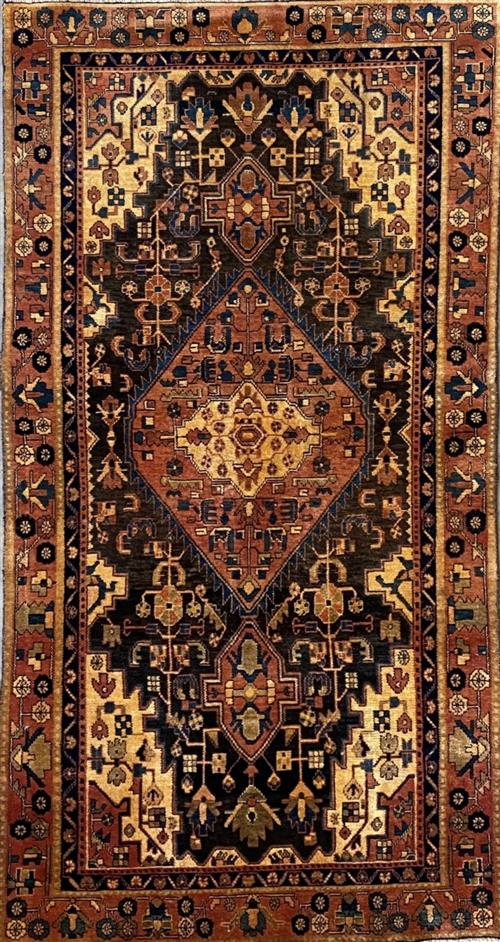 HAND-SPUN WOOL PILE & VEGETABLE DYES WITH NATURAL ABRASH COLOUR VARIATION. HAND-KNOTTED VILLAGE WEAVE FROM THE HAMADAN PROVINCE WITH DESIGN OF A BOLD ANCHORED HEXAGONAL MEDALLION WITHIN A FIELD OF RAMBLING FLORAL MOTIFS. BORDER OF FLORAL PATTERNS & PALMETTES.