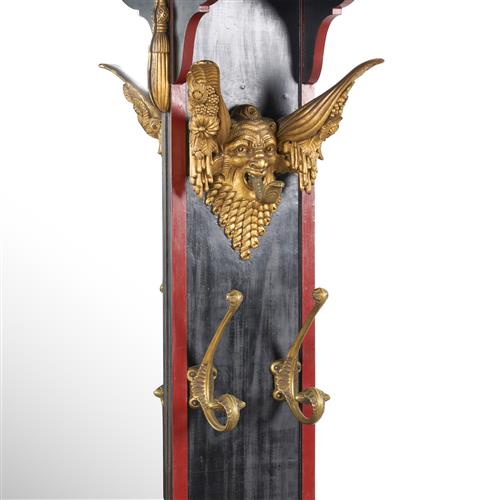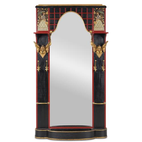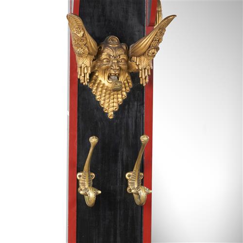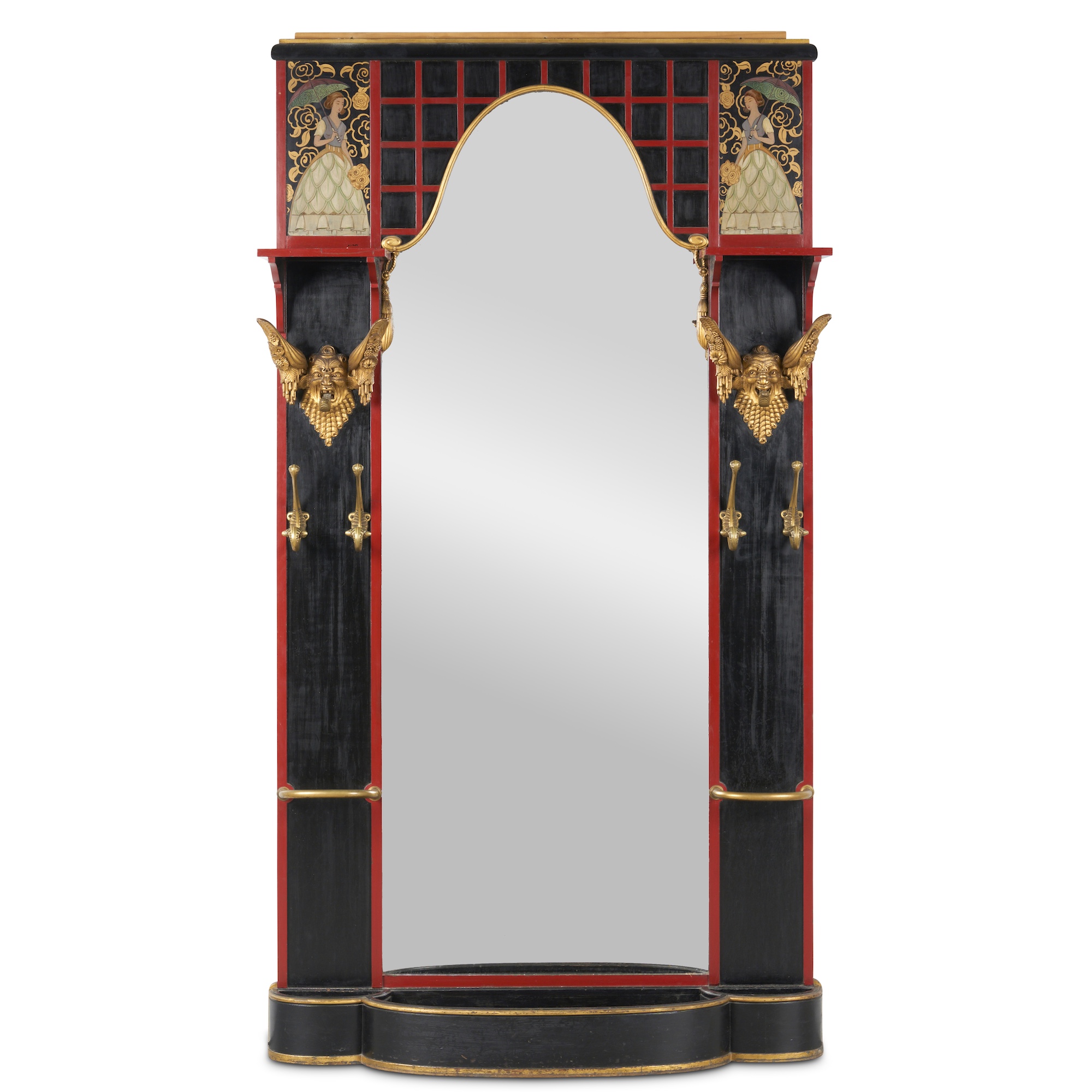 The full-height central mirror with arched top within a black and red-lacquered frame elaborately decorated with a painted figure of a lady at each upper corner above caned shelves and a pair of carved and gilt wood grotesque masks, the lower part of each side with a pair of brass hooks above a stick and umbrella stand flanking the bow-front jardinière to the base