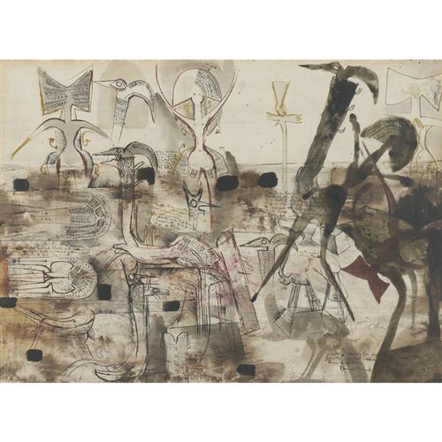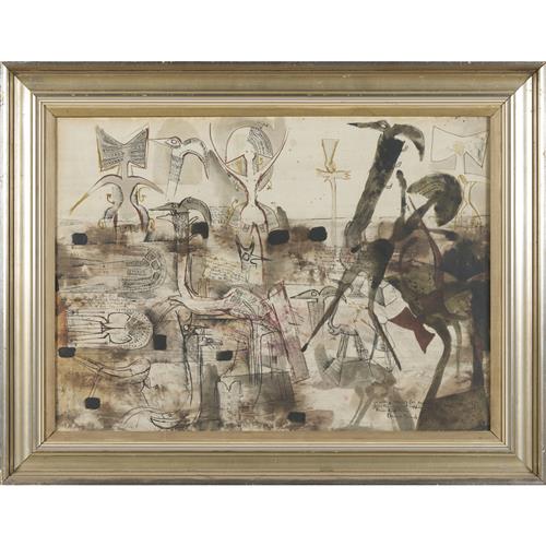 signed and inscribed lower right: working drawing for small garden/fountain in cut copper plating/ 'Rain-Bird Totem'/ Donald Friend