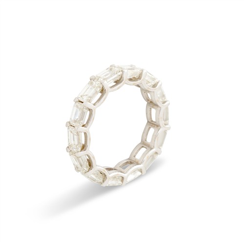 Designed as a continuous row of 14 claw-set emerald-cut diamonds together weighing 5.66 carats, mounted in 18ct white gold, size M1/2, gross weight approximately 4.4 grams.