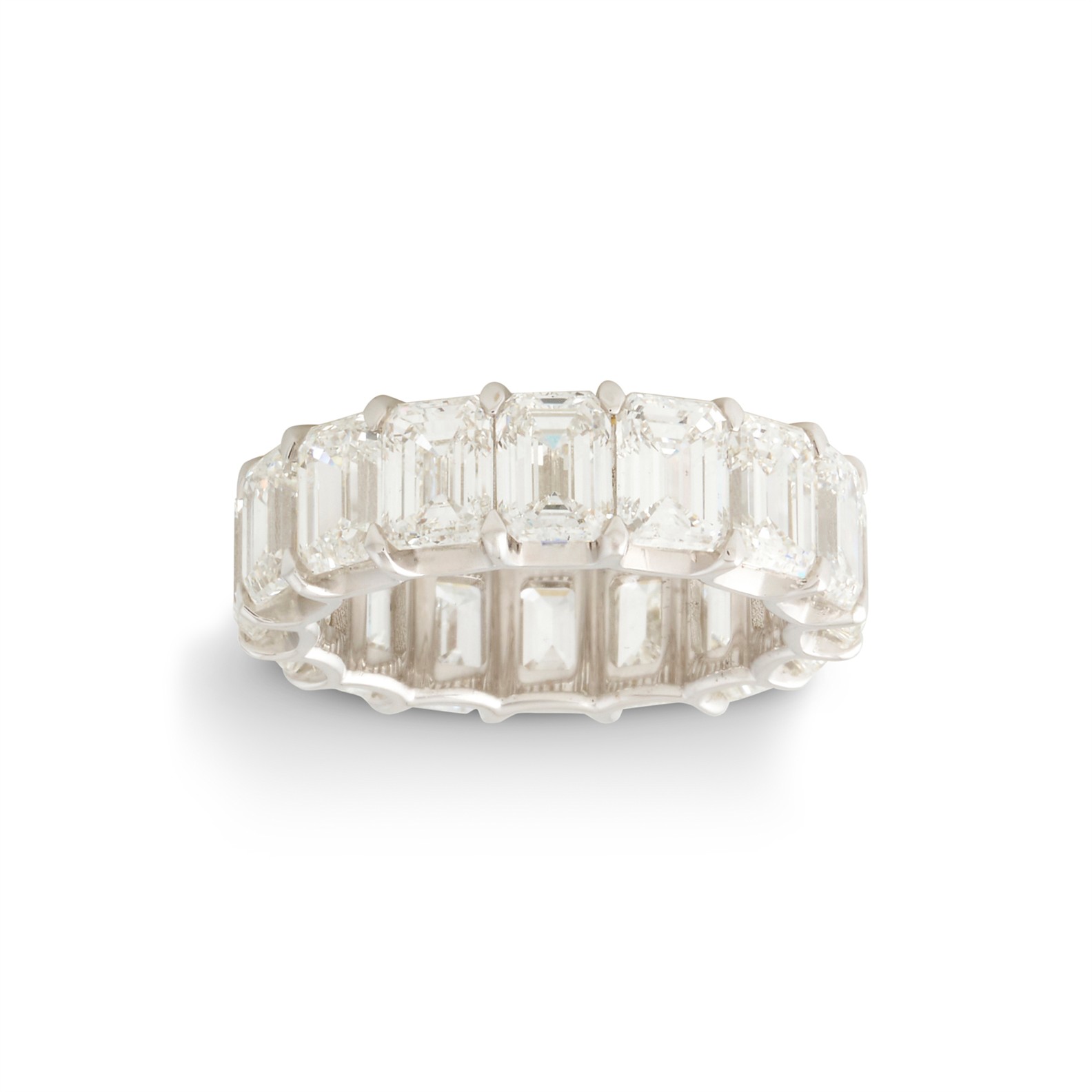 Designed as a continuous row of 16 claw-set emerald-cut diamonds together weighing 11.20 carats, mounted in 18ct white gold, size N, gross weight of approximately 7.4 grams.