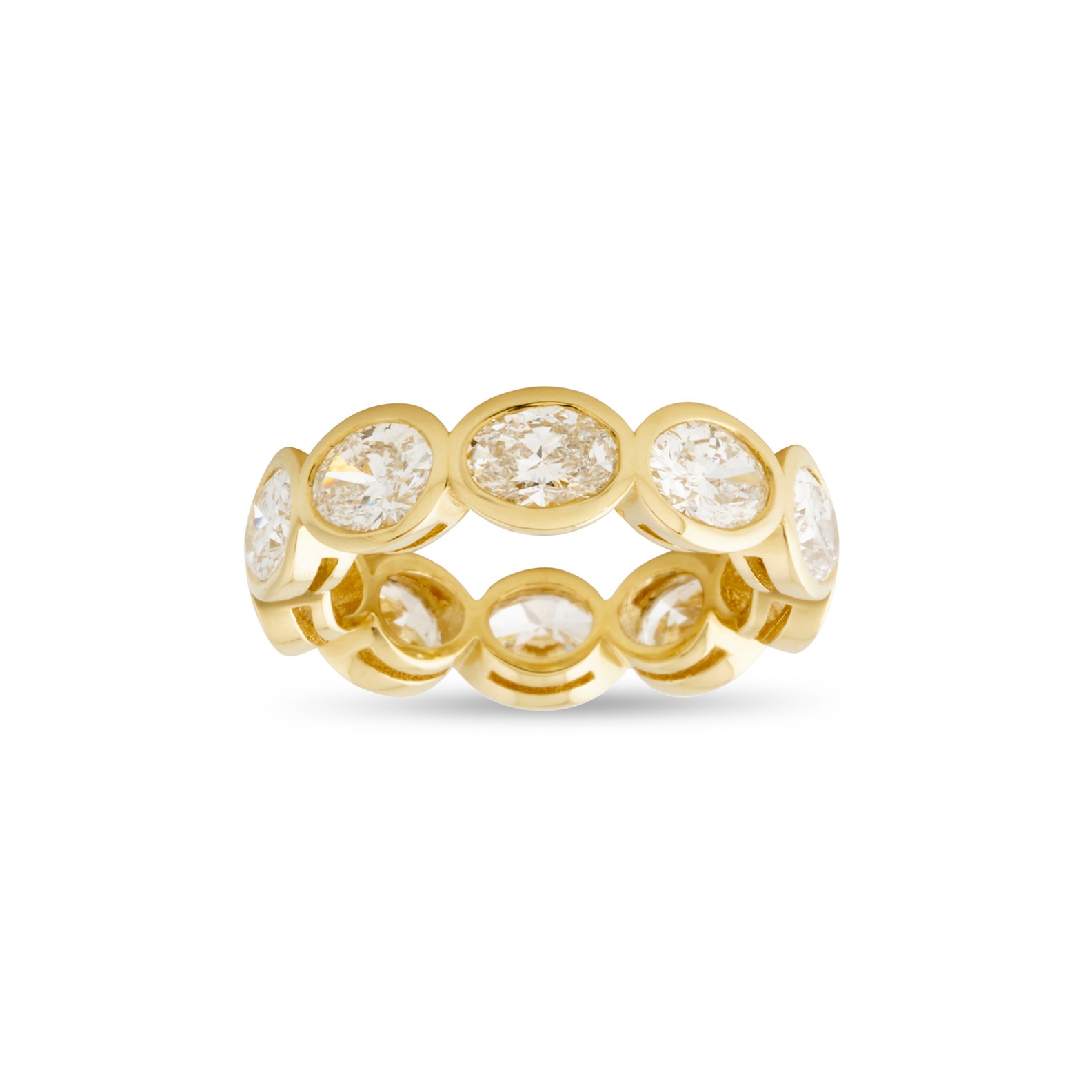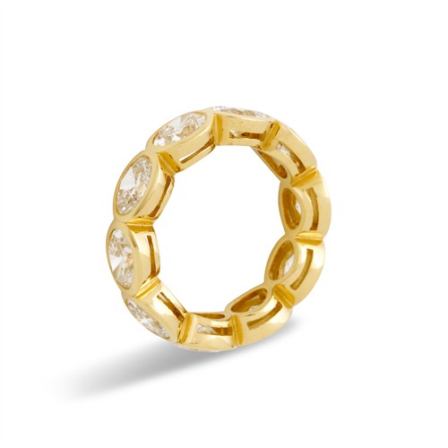 Designed as a continuous row of 10 collet-set oval brilliant-cut diamonds together weighing 5.08 carats, mounted in 18ct gold, size N, gross weight approximately 6.8 grams.