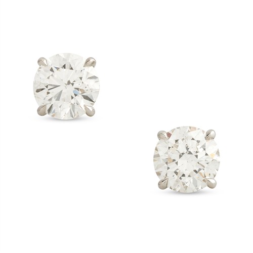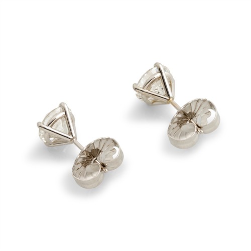 The round brilliant-cut diamonds each weighing 1.50 carats respectively, are claw-set, mounted in 18ct white gold, post and scroll fittings, gross weight approximately 2.7 grams.