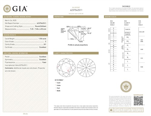 a GIA report (gia.edu/report-check-landing) numbered 6237542511 dated 26 March 2025 stating that the 1.50 carat diamond is natural, E colour, SI1 clarity;